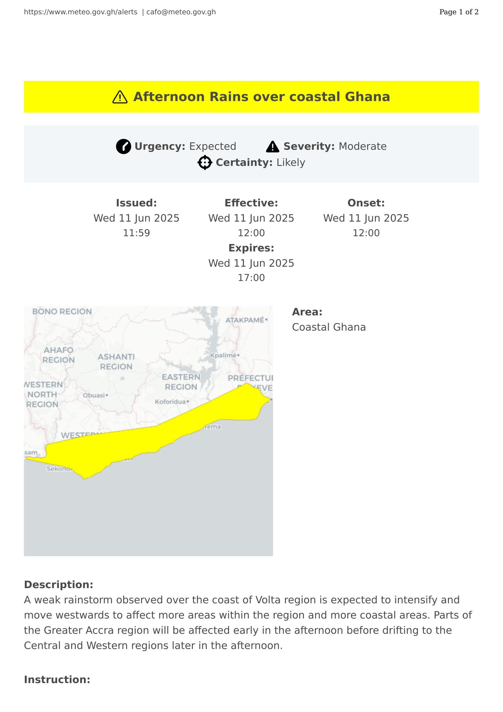 A weak rainstorm observed over the coast of Volta region is expected to intensify and move westwards to affect more areas within the region and more coastal areas. Parts of the Greater Accra region will be affected early in the afternoon before drifting to the Central and Western regions later in the afternoon.