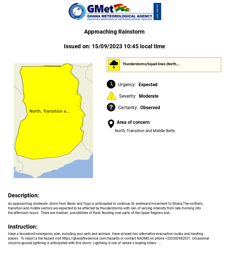 An approaching moderate storm from Benin and Togo is anticipated to continue its westward movement to Ghana.The northern, transition and middle sectors are expected to be affected by thunderstorms with rain of varying intensity from late morning into the afternoon hours. There are medium possibilities of flash flooding over parts of the Upper Regions and low lying areas within the middle sector. Moderate to strong winds are likely to accompany the rainstorm