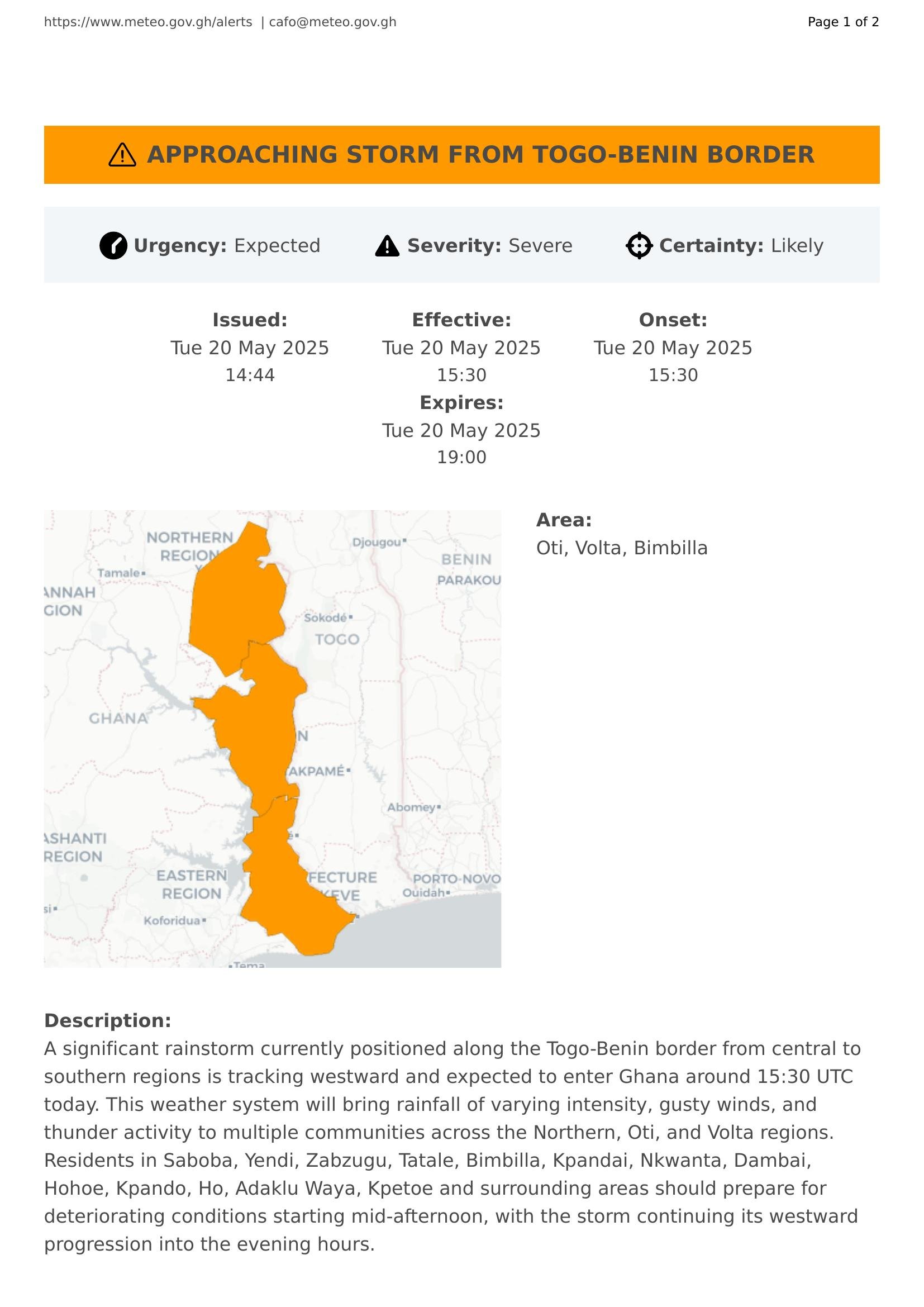 A significant rainstorm currently positioned along the Togo-Benin border from central to southern regions is tracking westward and expected to enter Ghana around 15:30 UTC today. This weather system will bring rainfall of varying intensity, gusty winds, and thunder activity to multiple communities across the Northern, Oti, and Volta regions. Residents in Saboba, Yendi, Zabzugu, Tatale, Bimbilla, Kpandai, Nkwanta, Dambai, Hohoe, Kpando, Ho, Adaklu Waya, Kpetoe and surrounding areas should prepare for deteriorating conditions starting mid-afternoon, with the storm continuing its westward progression into the evening hours.