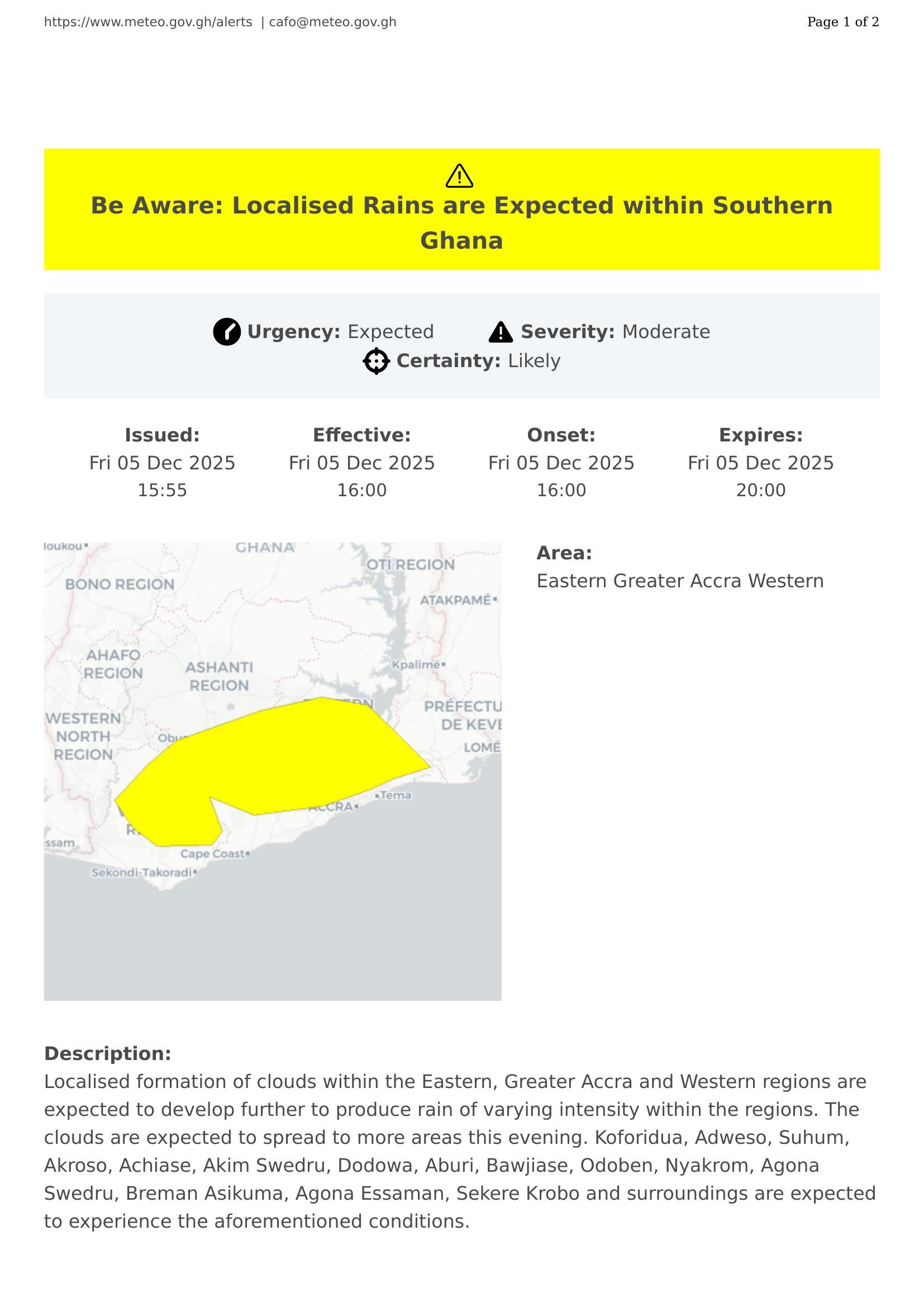 Localised formation of clouds within the Eastern, Greater Accra and Western regions are expected to develop further to produce rain of varying intensity within the regions. The clouds are expected to spread to more areas this evening. Koforidua, Adweso, Suhum, Akroso, Achiase, Akim Swedru, Dodowa, Aburi, Bawjiase, Odoben, Nyakrom, Agona Swedru, Breman Asikuma, Agona Essaman, Sekere Krobo and surroundings are expected to experience the aforementioned conditions.