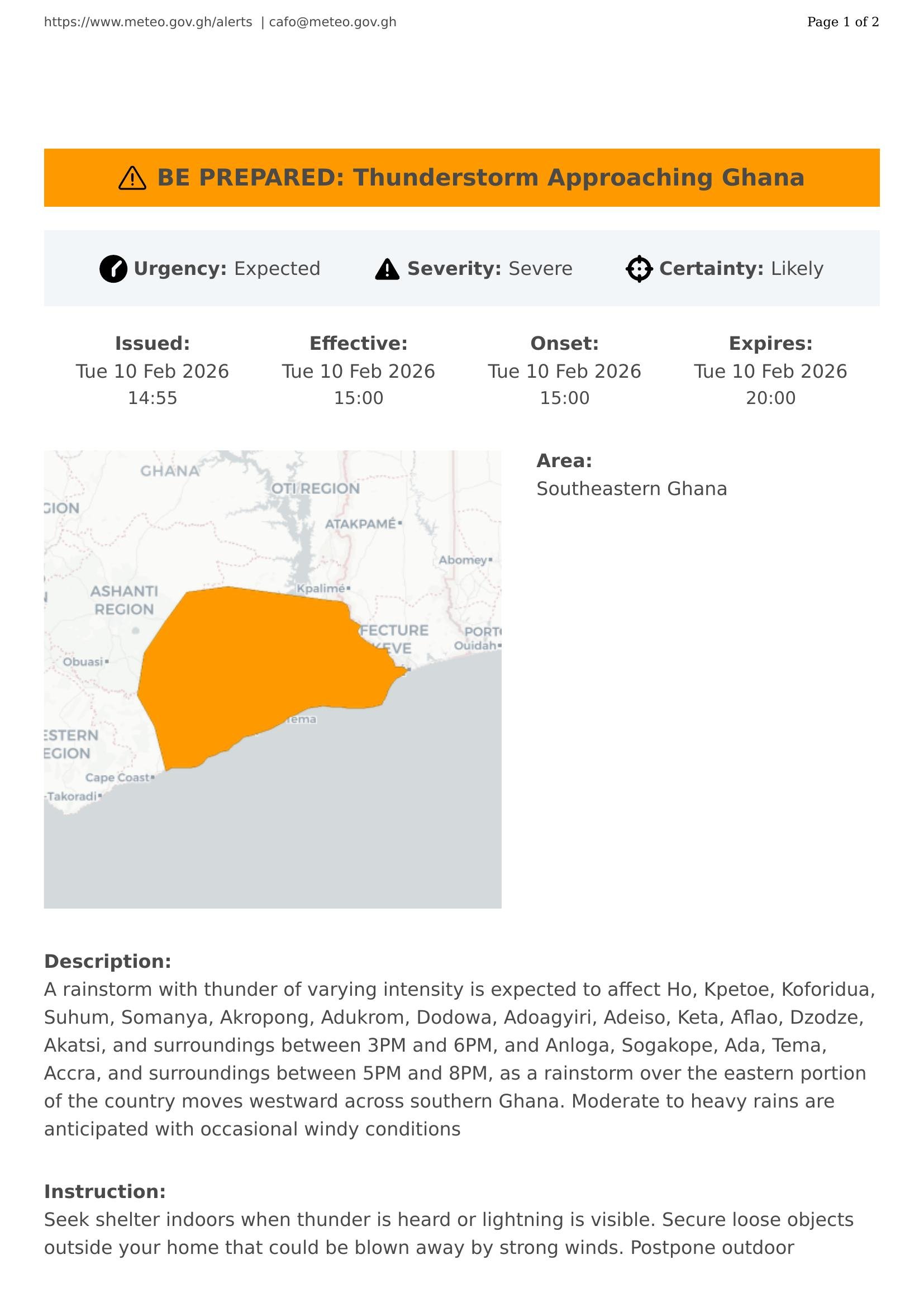A rainstorm with thunder of varying intensity is expected to affect Ho, Kpetoe, Koforidua, Suhum, Somanya, Akropong, Adukrom, Dodowa, Adoagyiri, Adeiso, Keta, Aflao, Dzodze, Akatsi, and surroundings between 3PM and 6PM, and Anloga, Sogakope, Ada, Tema, Accra, and surroundings between 5PM and 8PM, as a rainstorm over the eastern portion of the country moves westward across southern Ghana. Moderate to heavy rains are anticipated with occasional windy conditions