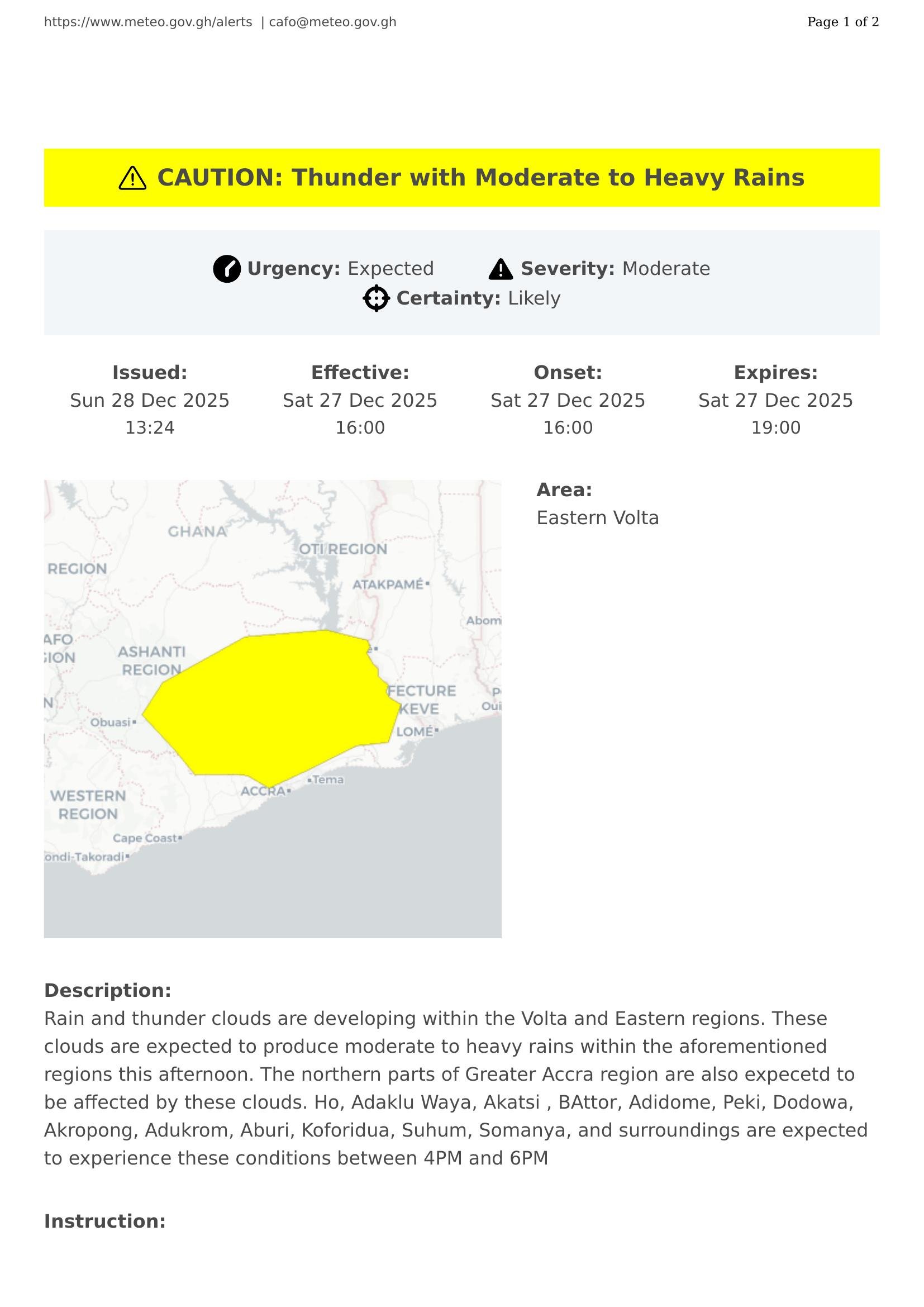 Seek shelter indoors when thunder is heard or lightning is visible. Secure loose objects outside your home that could be blown away by strong winds. Postpone outdoor activities until the event ceases. If driving, slow down and use headlights for better visibility. Keep updated on weather alerts through the Ghana Meteorological Agency.