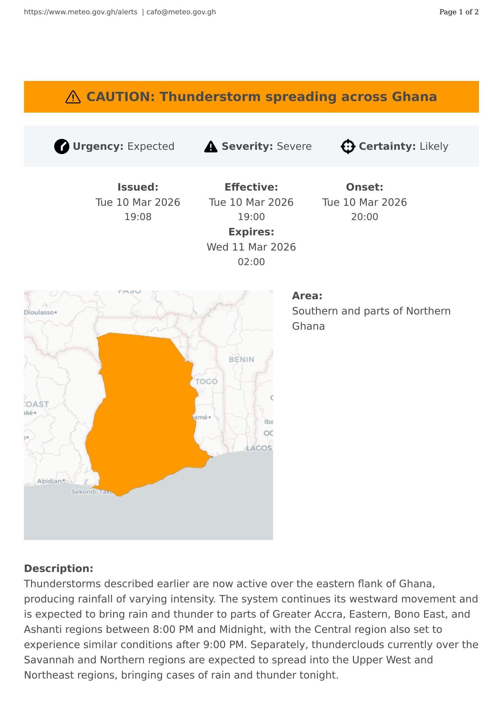 Thunderstorms described earlier are now active over the eastern flank of Ghana, producing rainfall of varying intensity. The system continues its westward movement and is expected to bring rain and thunder to parts of Greater Accra, Eastern, Bono East, and Ashanti regions between 8:00 PM and Midnight, with the Central region also set to experience similar conditions after 9:00 PM. Separately, thunderclouds currently over the Savannah and Northern regions are expected to spread into the Upper West and Northeast regions, bringing cases of rain and thunder tonight.