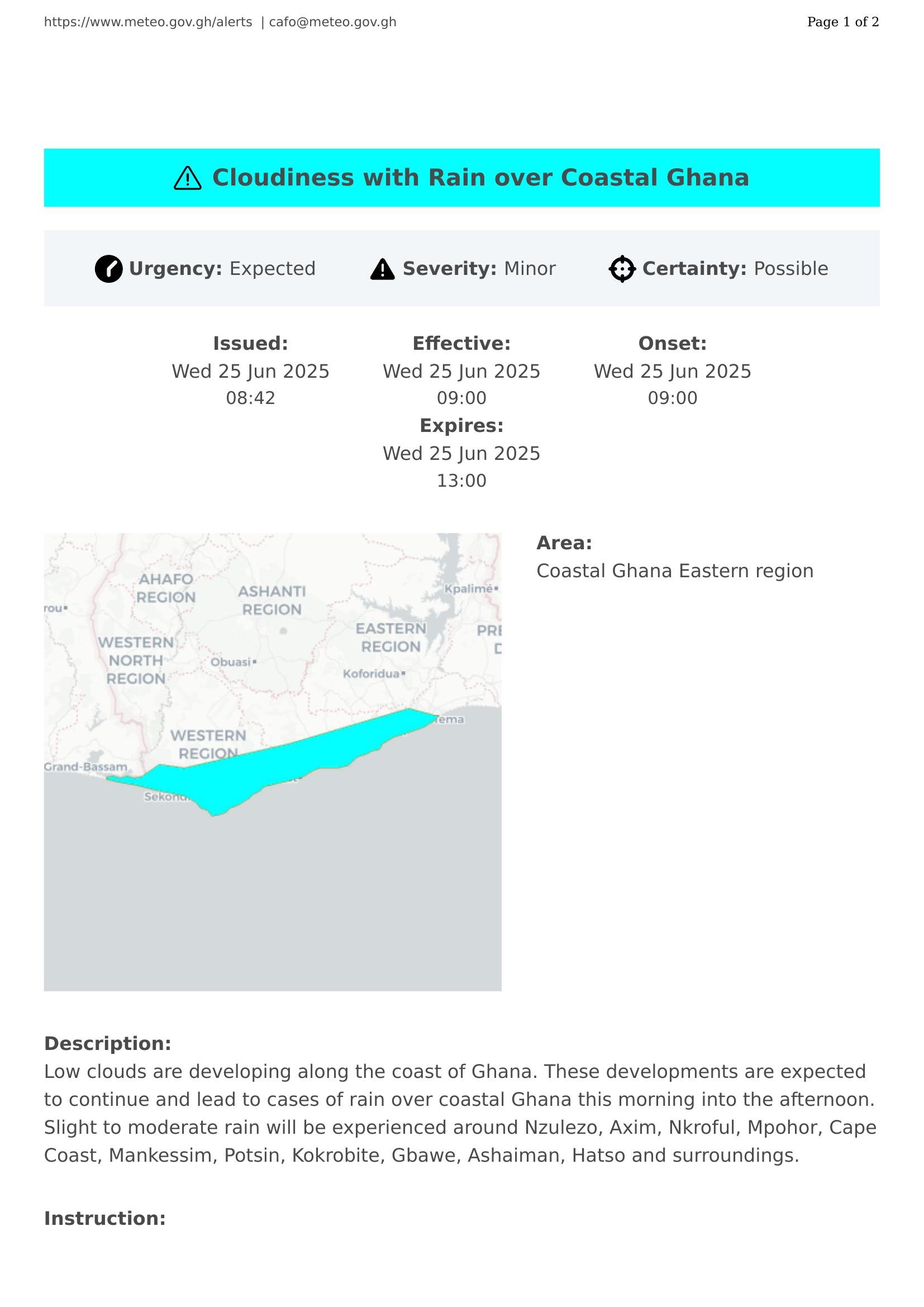 Low clouds are developing along the coast of Ghana. These developments are expected to continue and lead to cases of rain over coastal Ghana this morning into the afternoon. Slight to moderate rain will be experienced around Nzulezo, Axim, Nkroful, Mpohor, Cape Coast, Mankessim, Potsin, Kokrobite, Gbawe, Ashaiman, Hatso and surroundings.