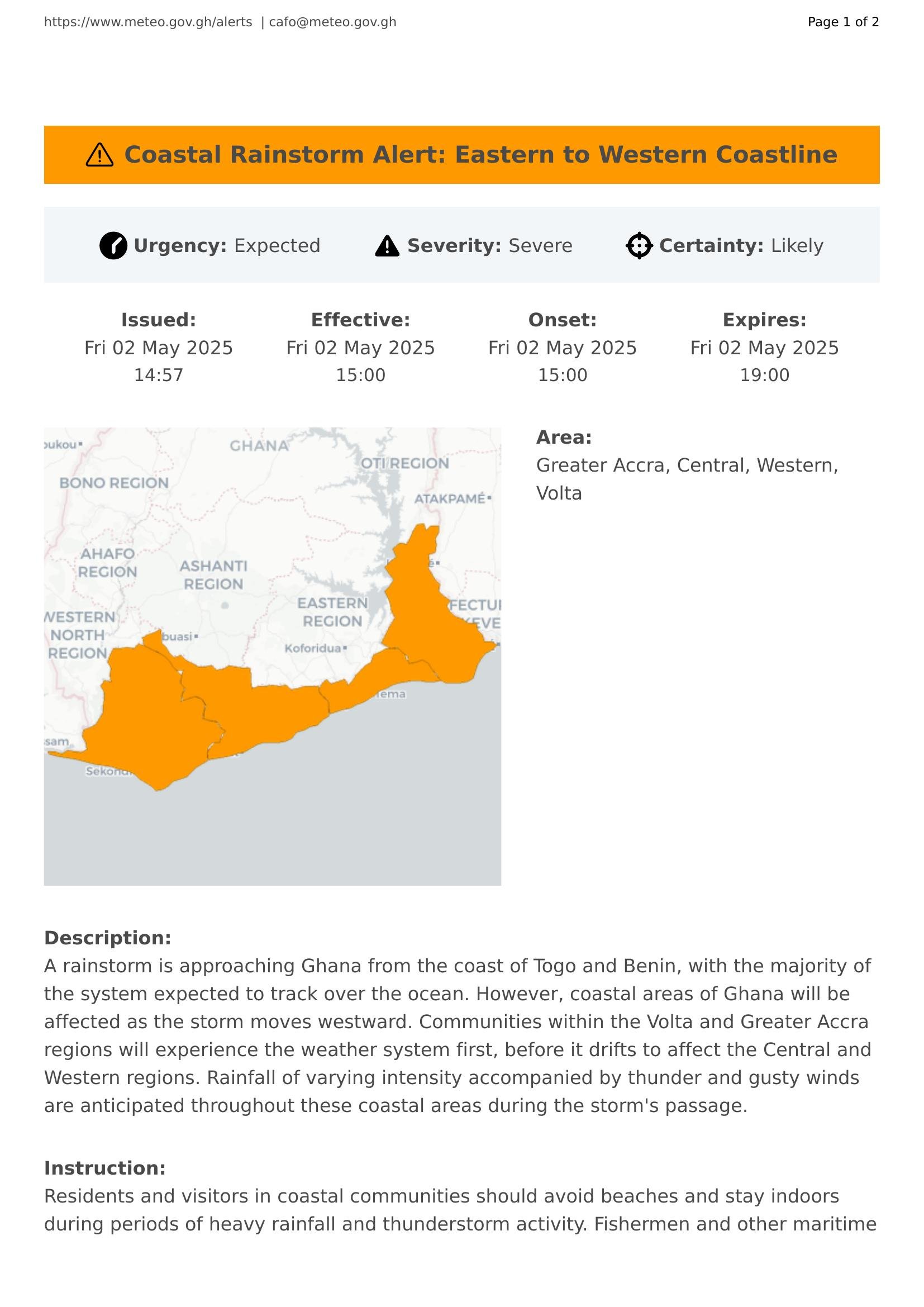 A rainstorm is approaching Ghana from the coast of Togo and Benin, with the majority of the system expected to track over the ocean. However, coastal areas of Ghana will be affected as the storm moves westward. Communities within the Volta and Greater Accra regions will experience the weather system first, before it drifts to affect the Central and Western regions. Rainfall of varying intensity accompanied by thunder and gusty winds are anticipated throughout these coastal areas during the storm's passage.