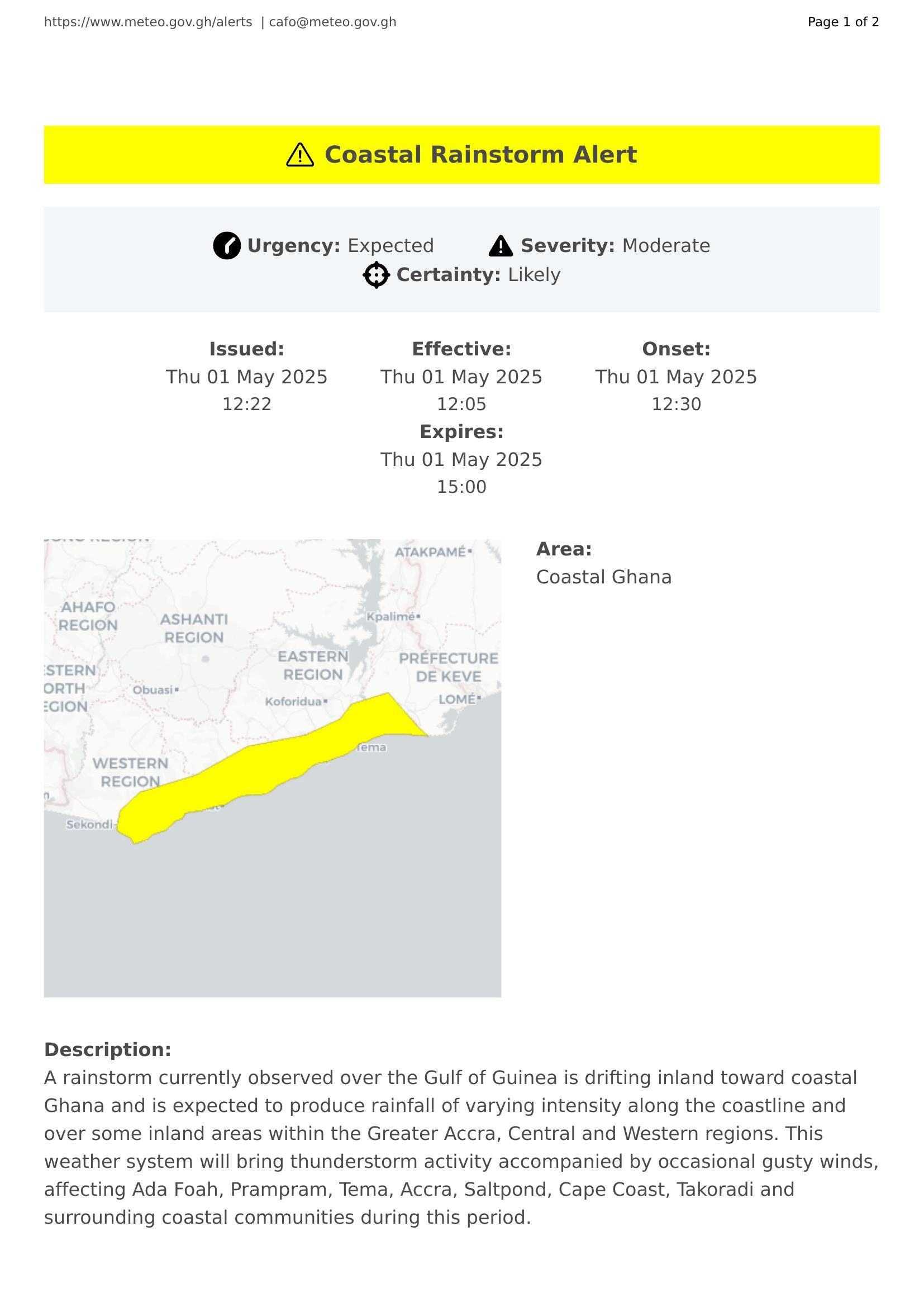 A rainstorm currently observed over the Gulf of Guinea is drifting inland toward coastal Ghana and is expected to produce rainfall of varying intensity along the coastline and over some inland areas within the Greater Accra, Central and Western regions. This weather system will bring thunderstorm activity accompanied by occasional gusty winds, affecting Ada Foah, Prampram, Tema, Accra, Saltpond, Cape Coast, Takoradi and surrounding coastal communities during this period.