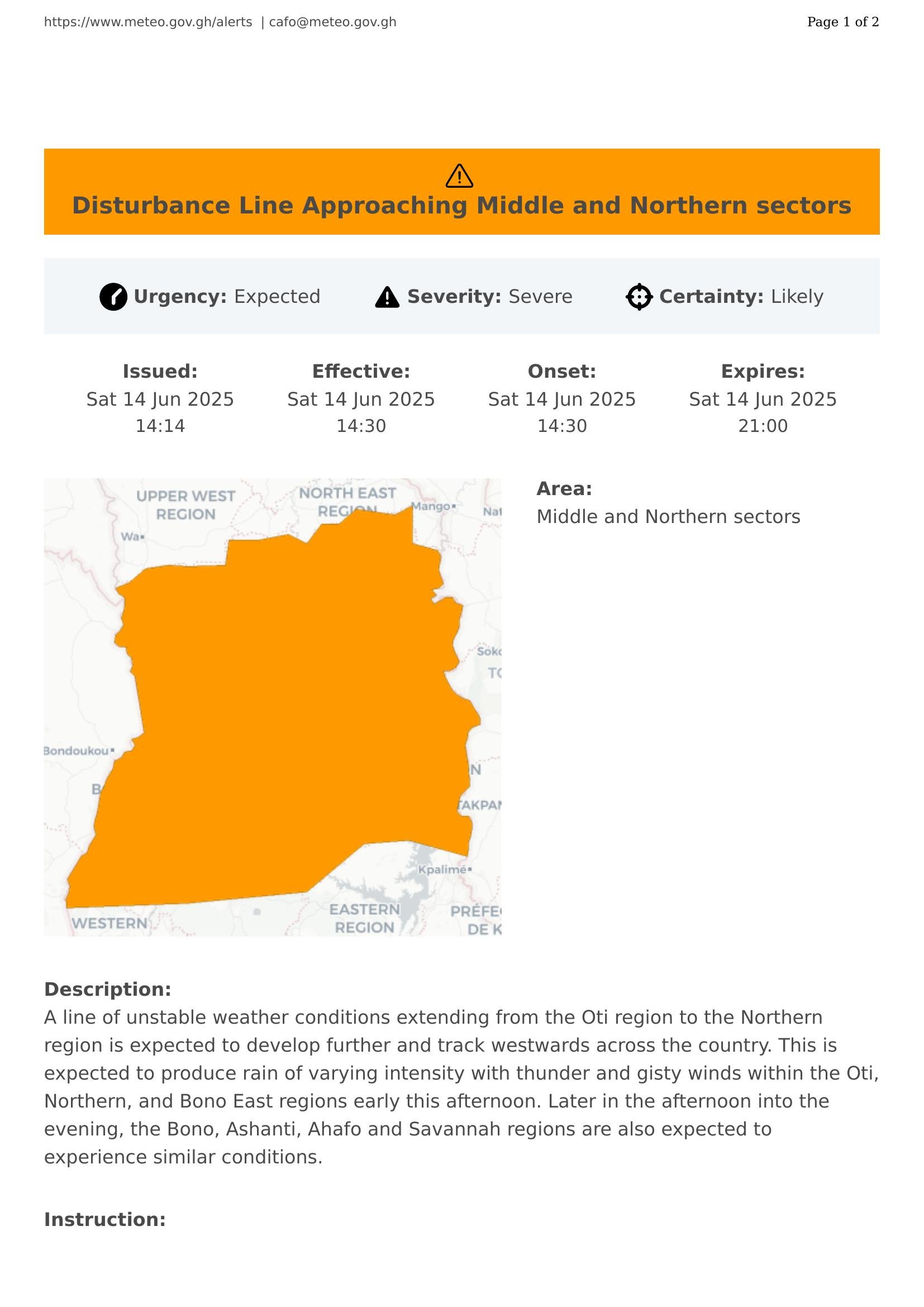 A line of unstable weather conditions extending from the Oti region to the Northern region is expected to develop further and track westwards across the country. This is expected to produce rain of varying intensity with thunder and gisty winds within the Oti, Northern, and Bono East regions early this afternoon. Later in the afternoon into the evening, the Bono, Ashanti, Ahafo and Savannah regions are also expected to experience similar conditions.