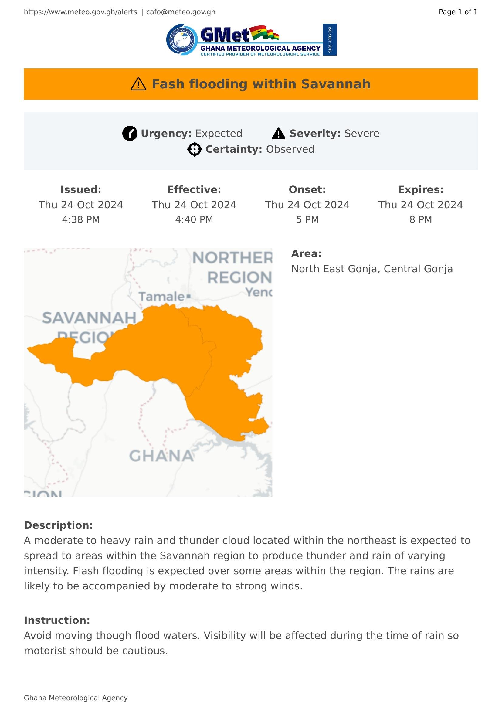 A moderate to heavy rain and thunder cloud located within the northeast is expected to spread to areas within the Savannah region to produce thunder and rain of varying intensity. Flash flooding is expected over some areas within the region. The rains are likely to be accompanied by moderate to strong winds.