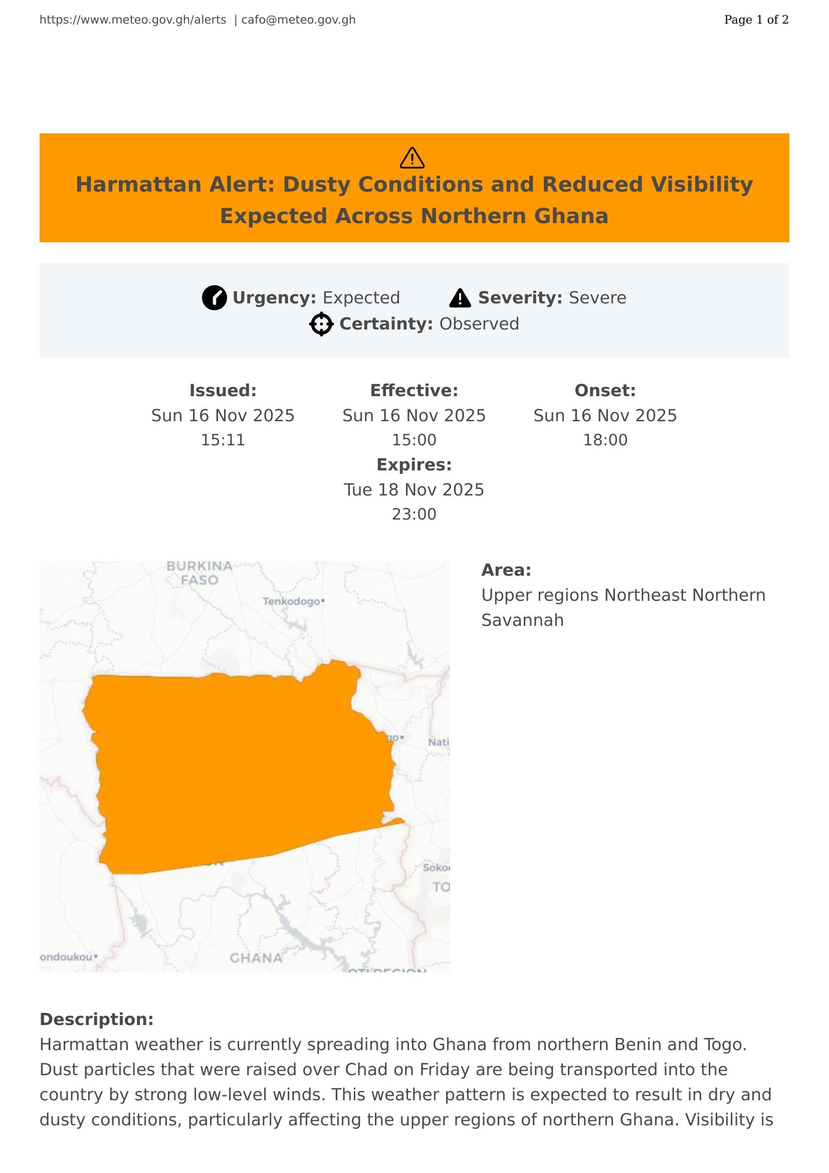 Harmattan Alert: Dusty Conditions and Reduced Visibility Expected Across Northern Ghana