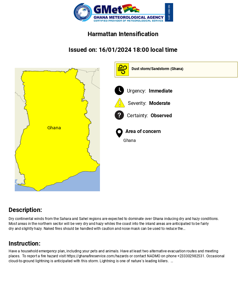 To report a fire hazard visit https://ghanafireservice.com/hazards or contact NADMO on phone +233302982531. Occasional cloud-to-ground lightning is anticipated with this storm. Lightning is one of nature`s leading killers.