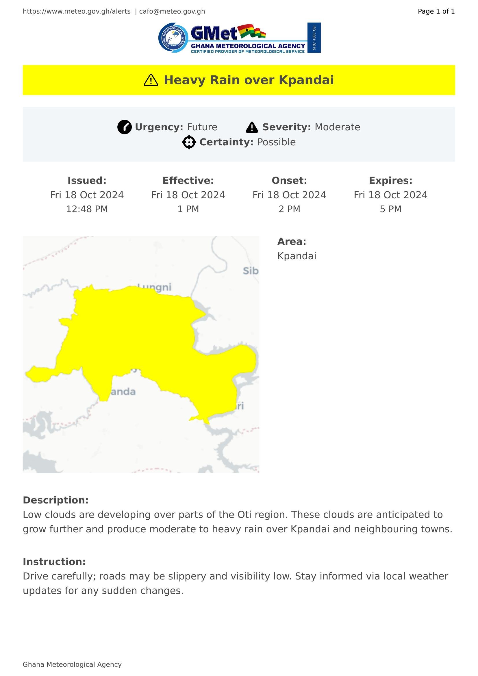 Low clouds are developing over parts of the Oti region. These clouds are anticipated to grow further and produce moderate to heavy rain over Kpandai and neighbouring towns.