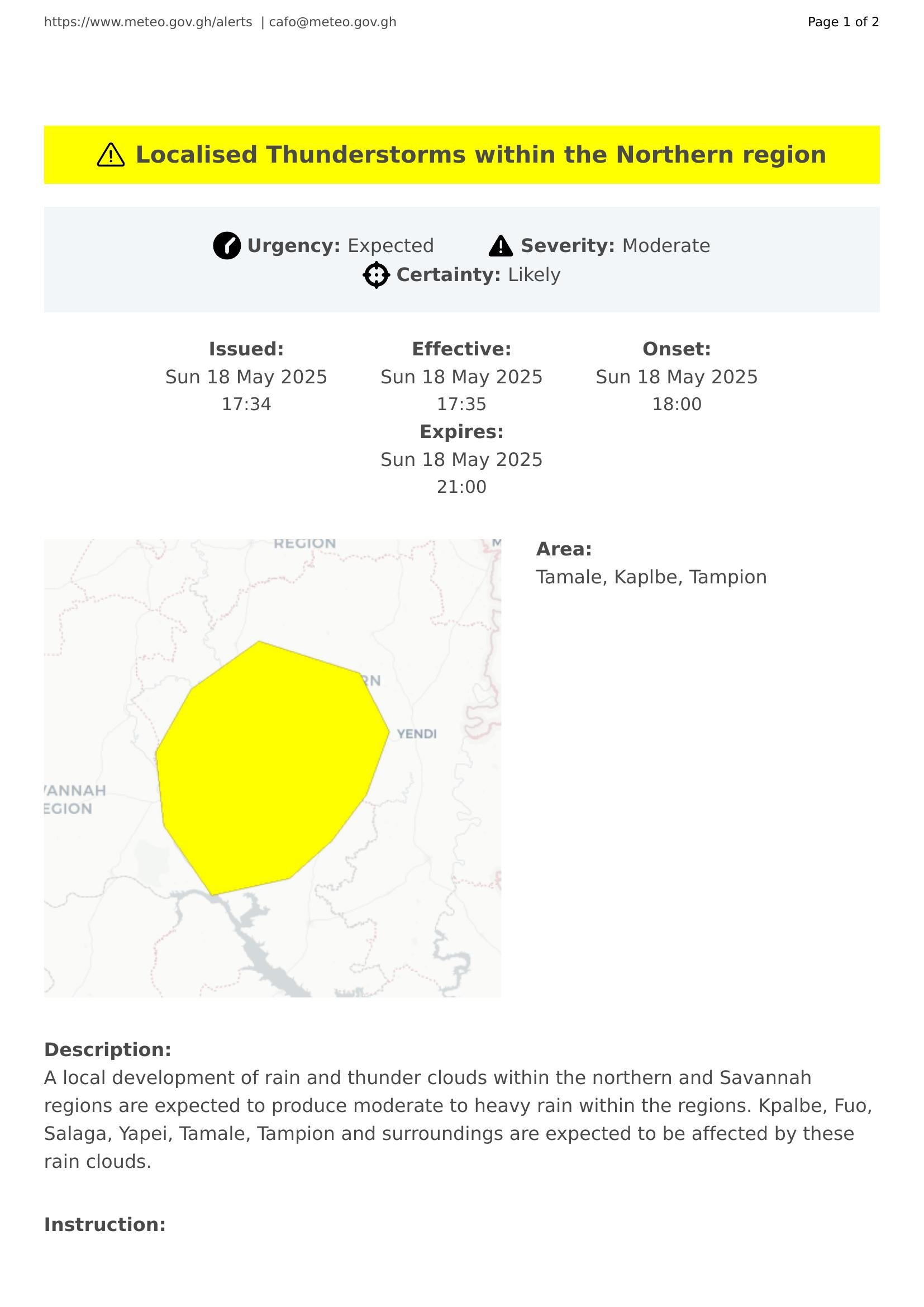 A local development of rain and thunder clouds within the northern and Savannah regions are expected to produce moderate to heavy rain within the regions. Kpalbe, Fuo, Salaga, Yapei, Tamale, Tampion and surroundings are expected to be affected by these rain clouds.