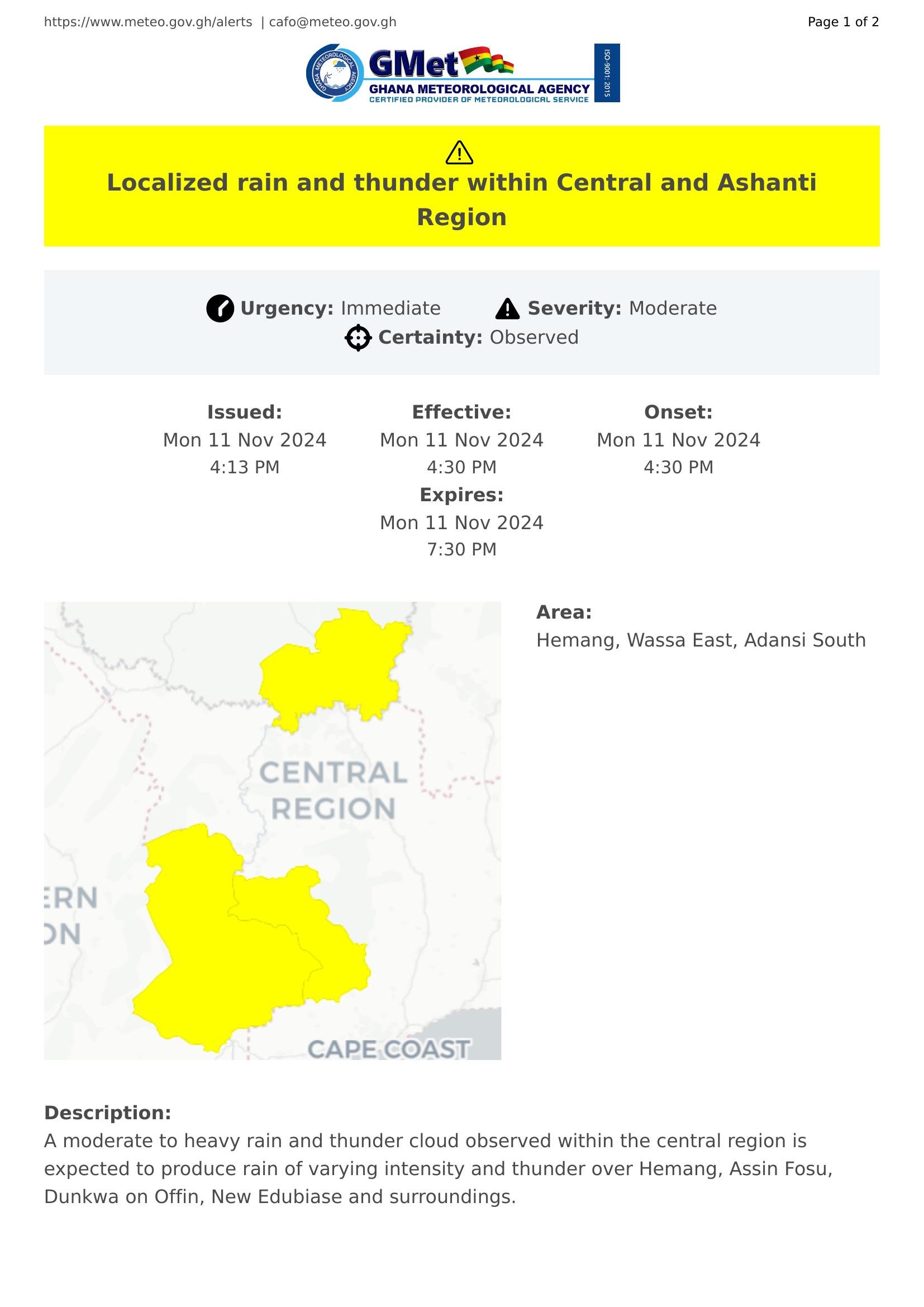 A moderate to heavy rain and thunder cloud observed within the central region is expected to produce rain of varying intensity and thunder over Hemang, Assin Fosu, Dunkwa on Offin, New Edubiase and surroundings.