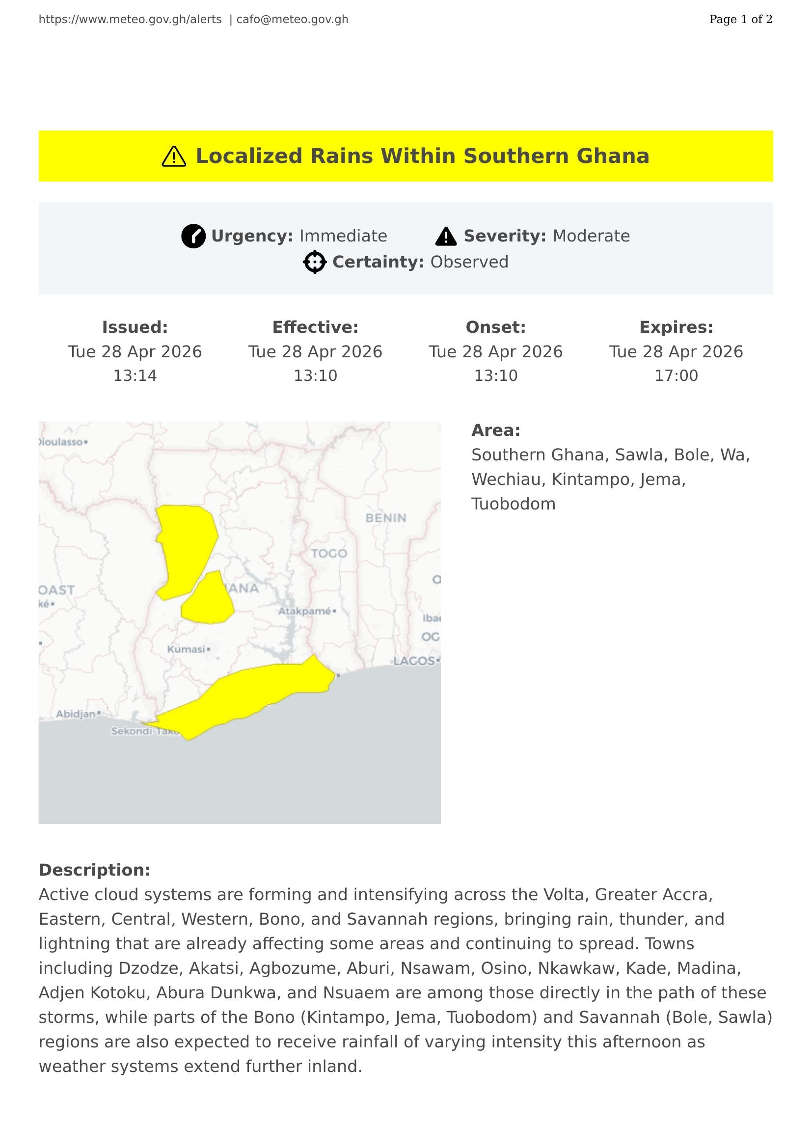 Active cloud systems are forming and intensifying across the Volta, Greater Accra, Eastern, Central, Western, Bono, and Savannah regions, bringing rain, thunder, and lightning that are already affecting some areas and continuing to spread. Towns including Dzodze, Akatsi, Agbozume, Aburi, Nsawam, Osino, Nkawkaw, Kade, Madina, Adjen Kotoku, Abura Dunkwa, and Nsuaem are among those directly in the path of these storms, while parts of the Bono (Kintampo, Jema, Tuobodom) and Savannah (Bole, Sawla) regions are also expected to receive rainfall of varying intensity this afternoon as weather systems extend further inland.