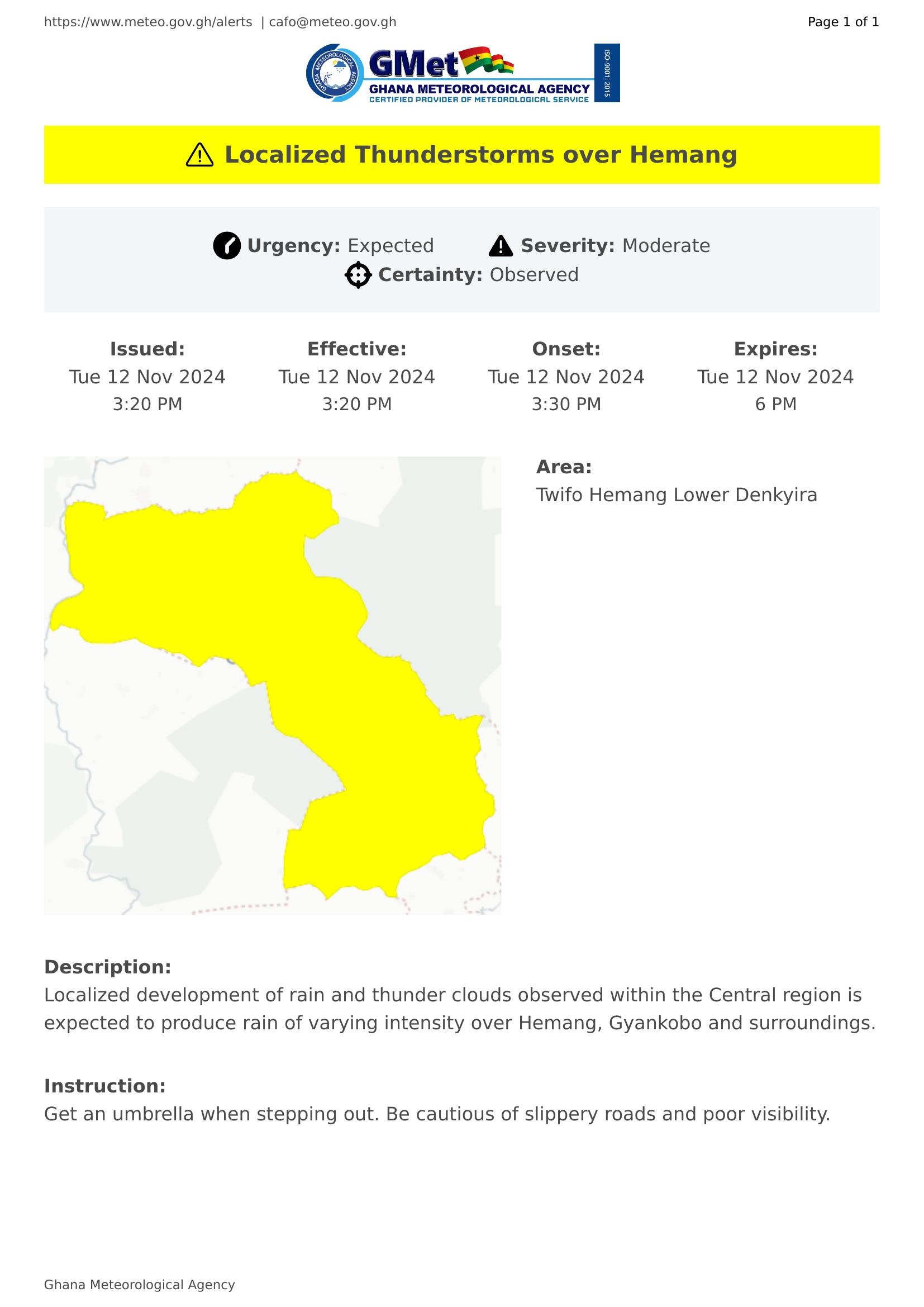 Localized development of rain and thunder clouds observed within the Central region is expected to produce rain of varying intensity over Hemang, Gyankobo and surroundings.