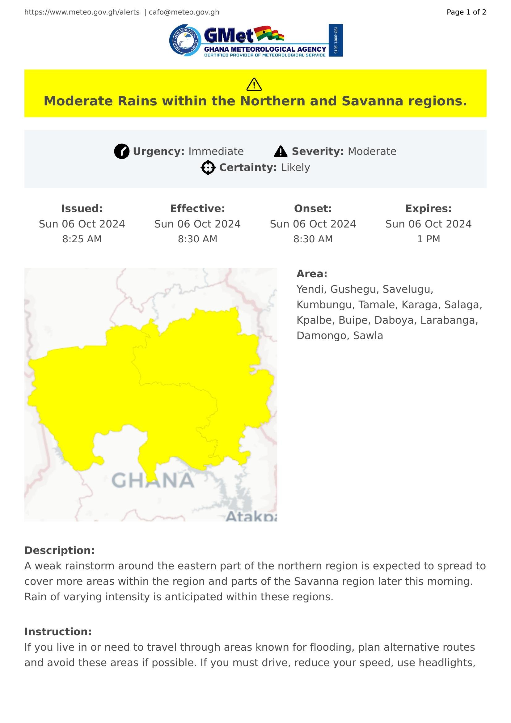 A weak rainstorm around the eastern part of the northern region is expected to spread to cover more areas within the region and parts of the Savanna region later this morning. Rain of varying intensity is anticipated within these regions.