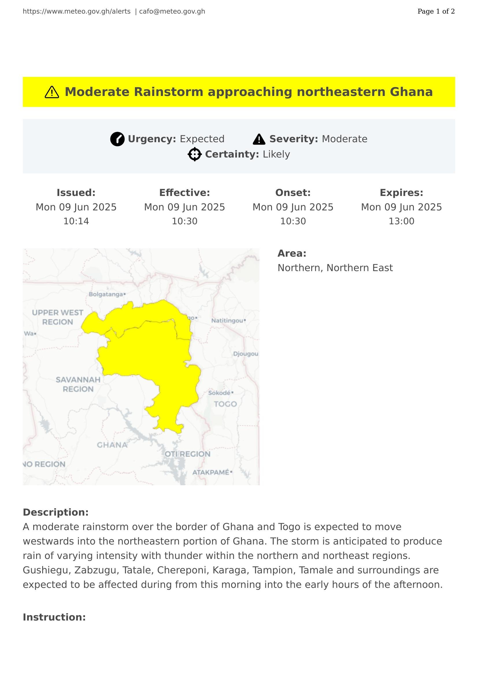 A moderate rainstorm over the border of Ghana and Togo is expected to move westwards into the northeastern portion of Ghana. The storm is anticipated to produce rain of varying intensity with thunder within the northern and northeast regions. Gushiegu, Zabzugu, Tatale, Chereponi, Karaga, Tampion, Tamale and surroundings are expected to be affected during from this morning into the early hours of the afternoon.
