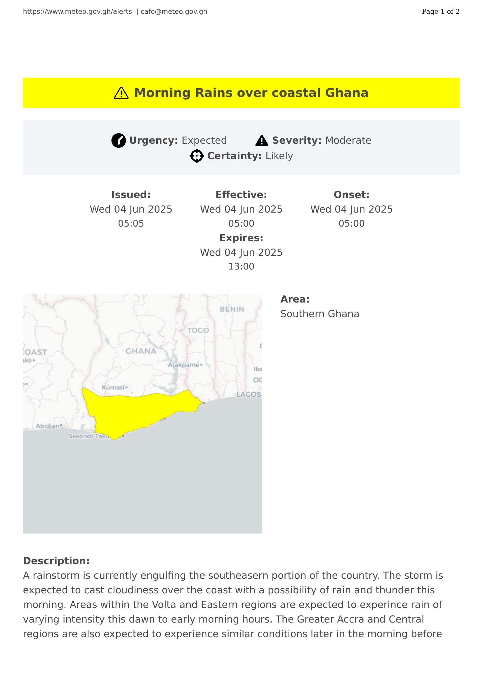 A rainstorm is currently engulfing the southeasern portion of the country. The storm is expected to cast cloudiness over the coast with a possibility of rain and thunder this morning. Areas within the Volta and Eastern regions are expected to experince rain of varying intensity this dawn to early morning hours. The Greater Accra and Central regions are also expected to experience similar conditions later in the morning before drifting to the western region. Cloudiness will dominate the day with occasional thunder and rains.