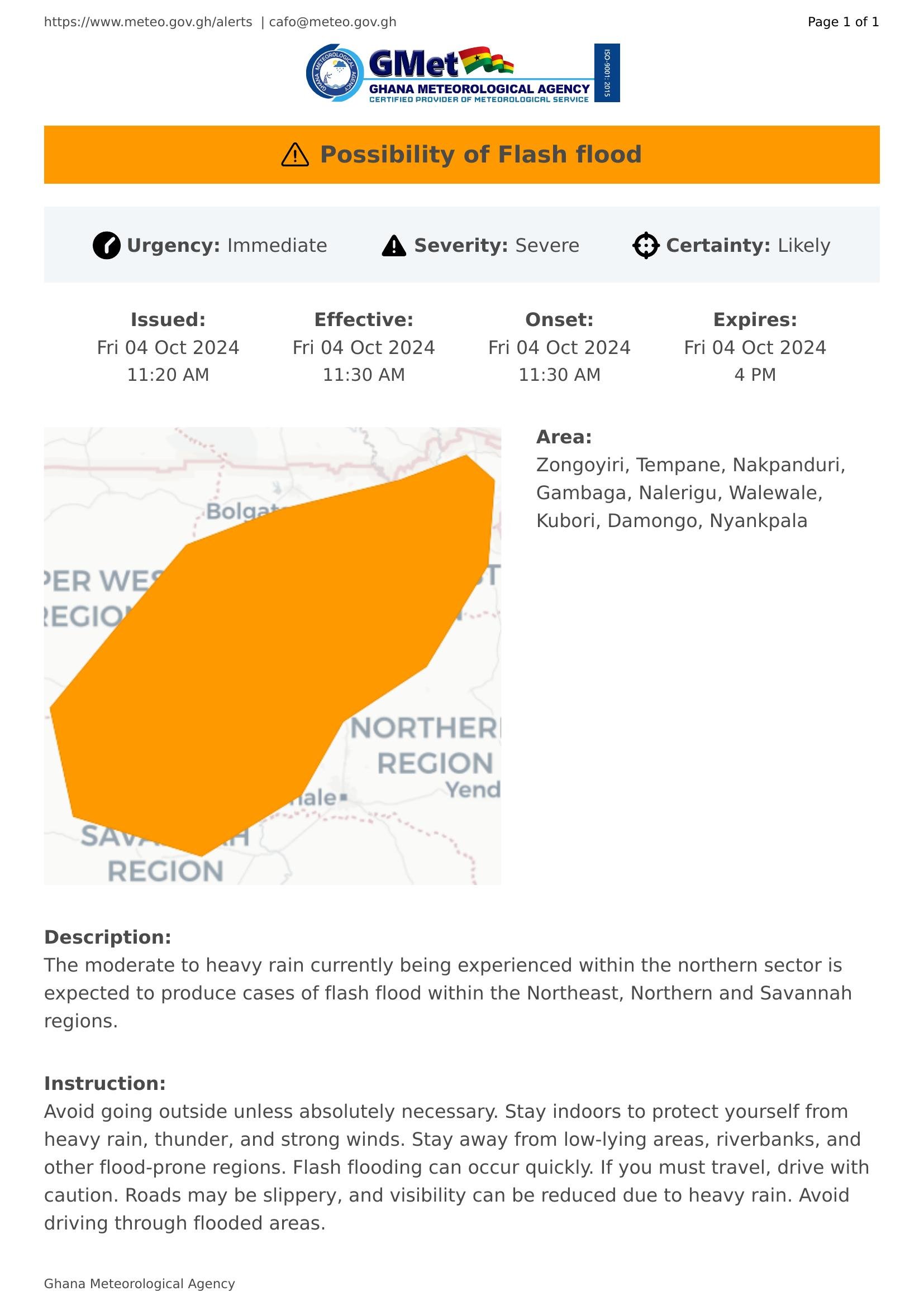 The moderate to heavy rain currently being experienced within the northern sector is expected to produce cases of flash flood within the Northeast, Northern and Savannah regions.
