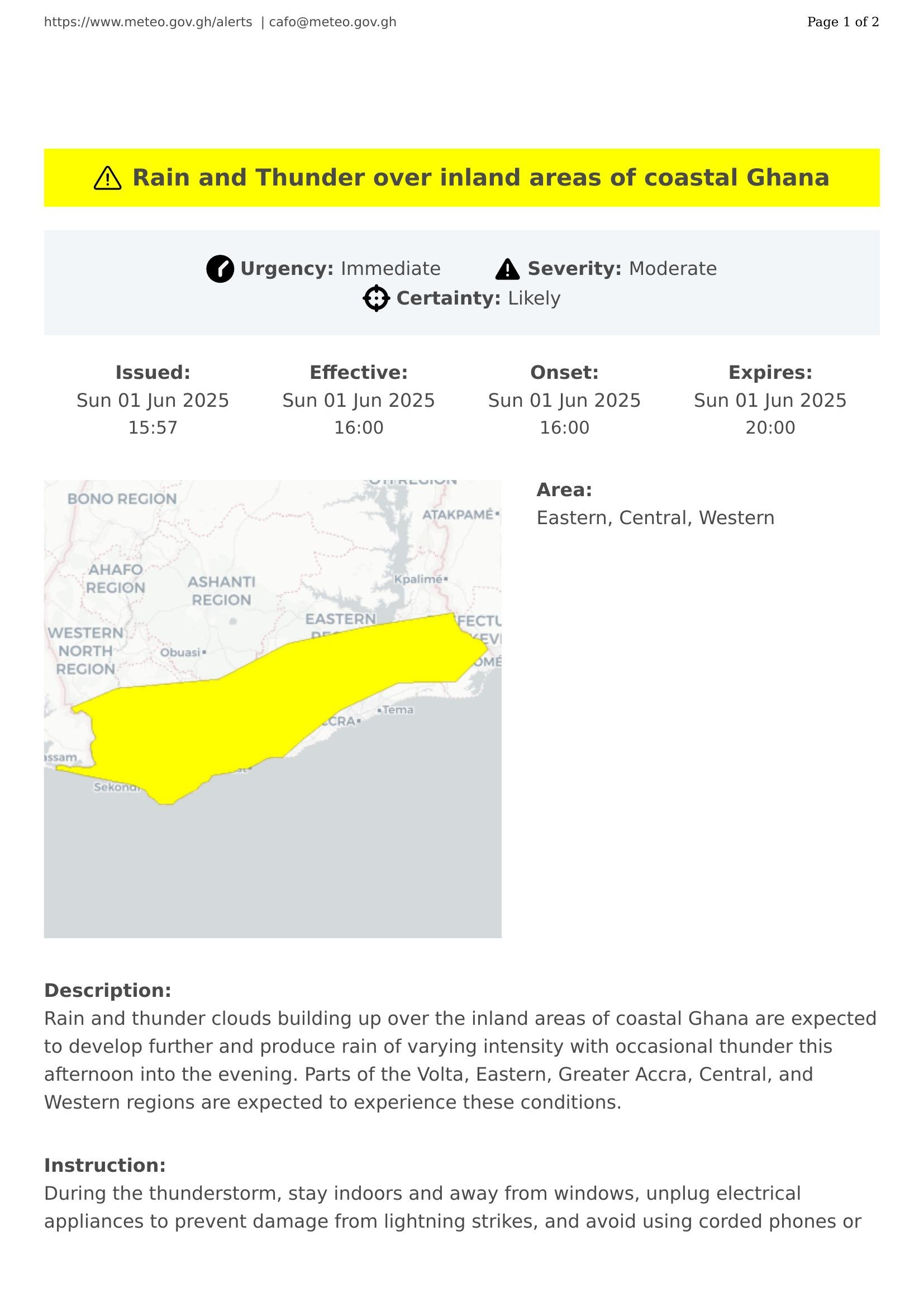 Rain and thunder clouds building up over the inland areas of coastal Ghana are expected to develop further and produce rain of varying intensity with occasional thunder this afternoon into the evening. Parts of the Volta, Eastern, Greater Accra, Central, and Western regions are expected to experience these conditions.