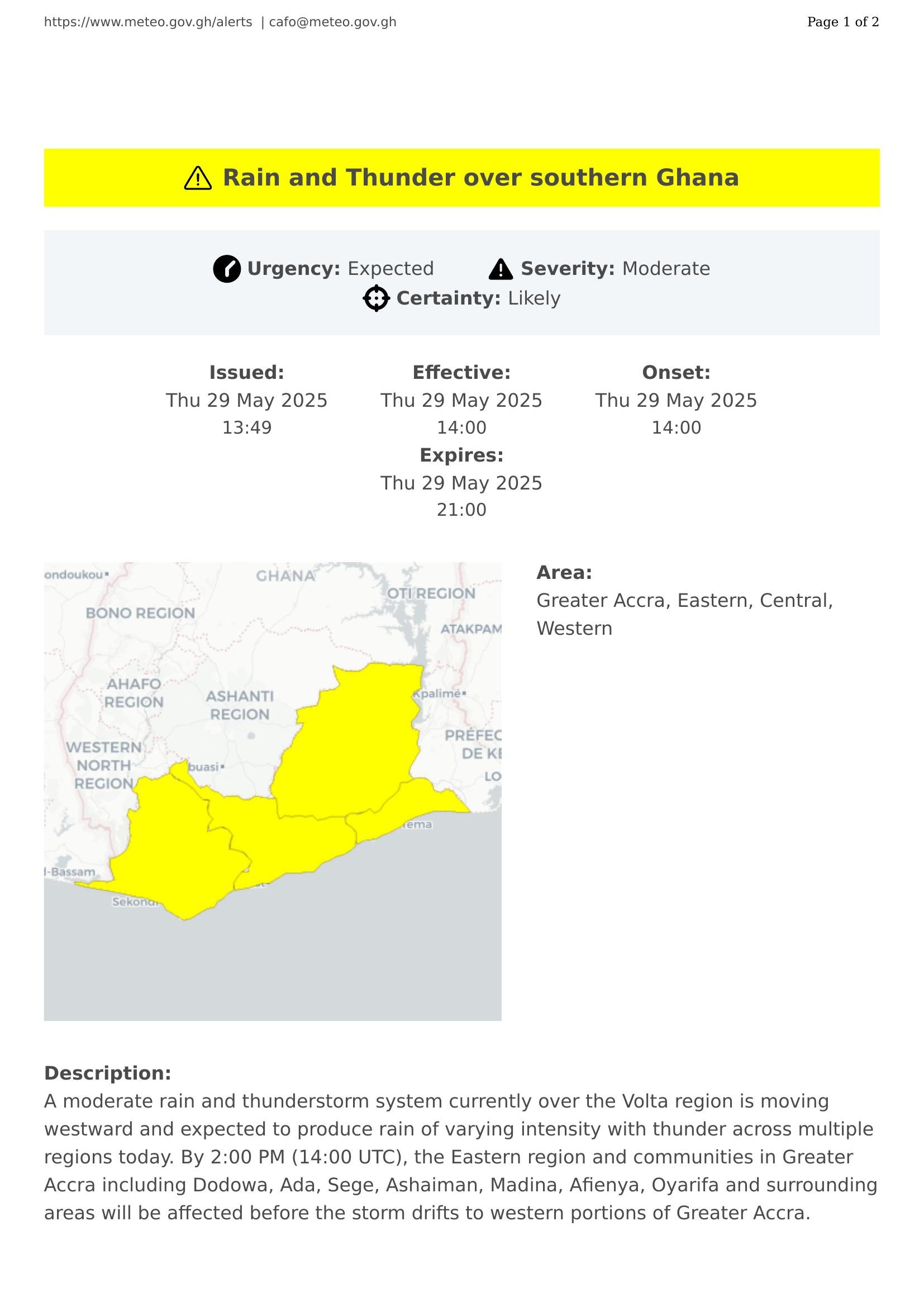 A moderate rain and thunderstorm system currently over the Volta region is moving westward and expected to produce rain of varying intensity with thunder across multiple regions today. By 2:00 PM (14:00 UTC), the Eastern region and communities in Greater Accra including Dodowa, Ada, Sege, Ashaiman, Madina, Afienya, Oyarifa and surrounding areas will be affected before the storm drifts to western portions of Greater Accra. Around 3:00 PM (15:00 UTC), the system will move into the Central region, and by late afternoon into evening, it will reach the Western region.