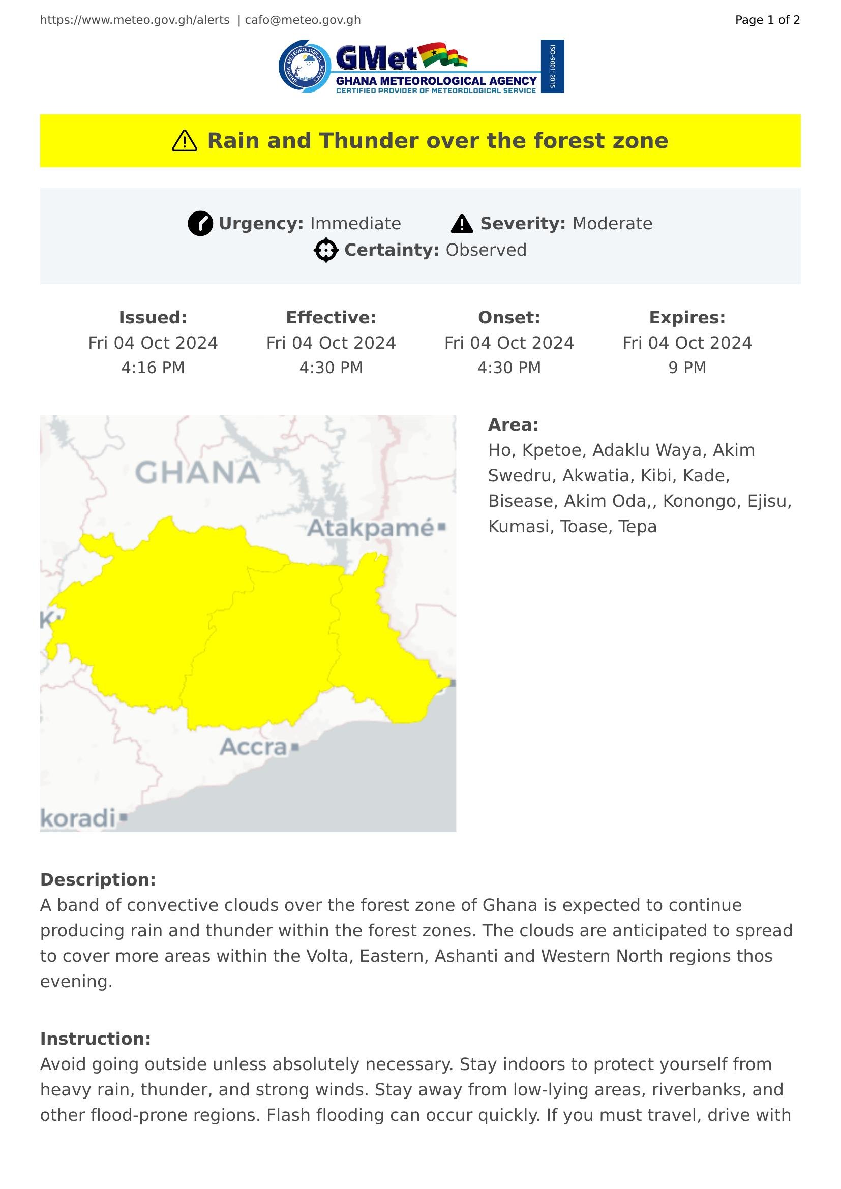 A band of convective clouds over the forest zone of Ghana is expected to continue producing rain and thunder within the forest zones. The clouds are anticipated to spread to cover more areas within the Volta, Eastern, Ashanti and Western North regions thos evening.