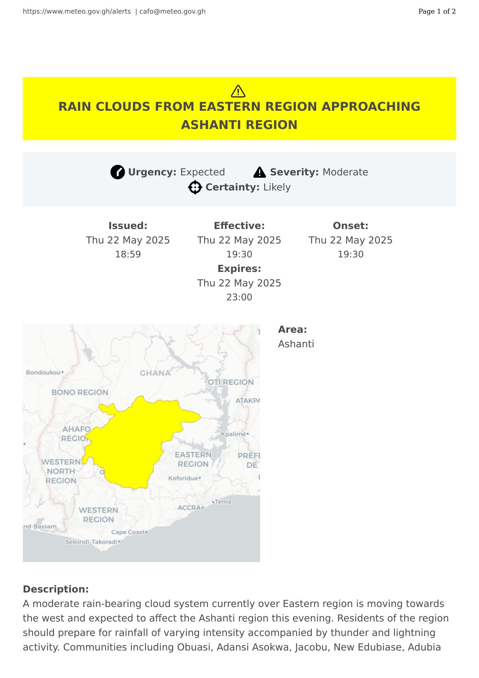 A moderate rain-bearing cloud system currently over Eastern region is moving towards the west and expected to affect the Ashanti region this evening. Residents of the region should prepare for rainfall of varying intensity accompanied by thunder and lightning activity. Communities including Obuasi, Adansi Asokwa, Jacobu, New Edubiase, Adubia Fomena and surrounding will be affected early in the evening before drifting to Konongo, Juansa, Agogo, Kumasi, Mampong, Ejisu, Offinso, Barekese and surroundings.