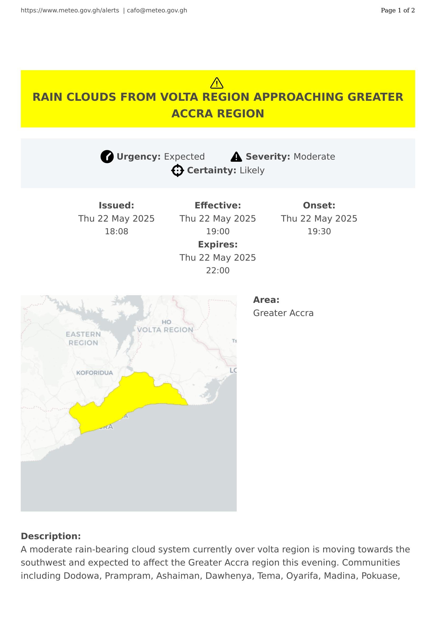 A moderate rain-bearing cloud system currently over volta region is moving towards the southwest and expected to affect the Greater Accra region this evening. Communities including Dodowa, Prampram, Ashaiman, Dawhenya, Tema, Oyarifa, Madina, Pokuase, Afienya, Medie, Amasaman and surrounding areas should prepare for rainfall of varying intensity accompanied by thunder and lightning activity.