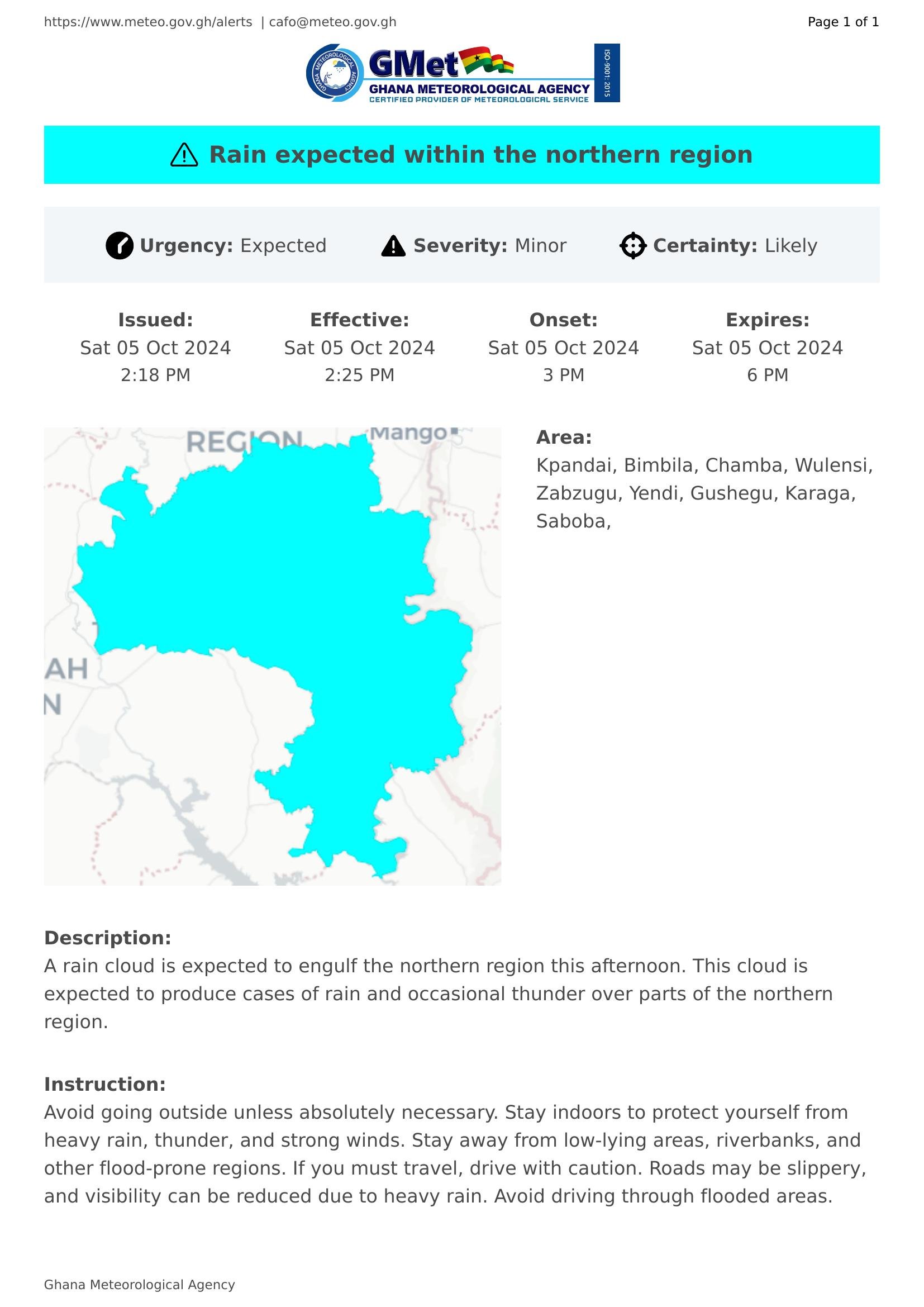 A rain cloud is expected to engulf the northern region this afternoon. This cloud is expected to produce cases of rain and occasional thunder over parts of the northern region.