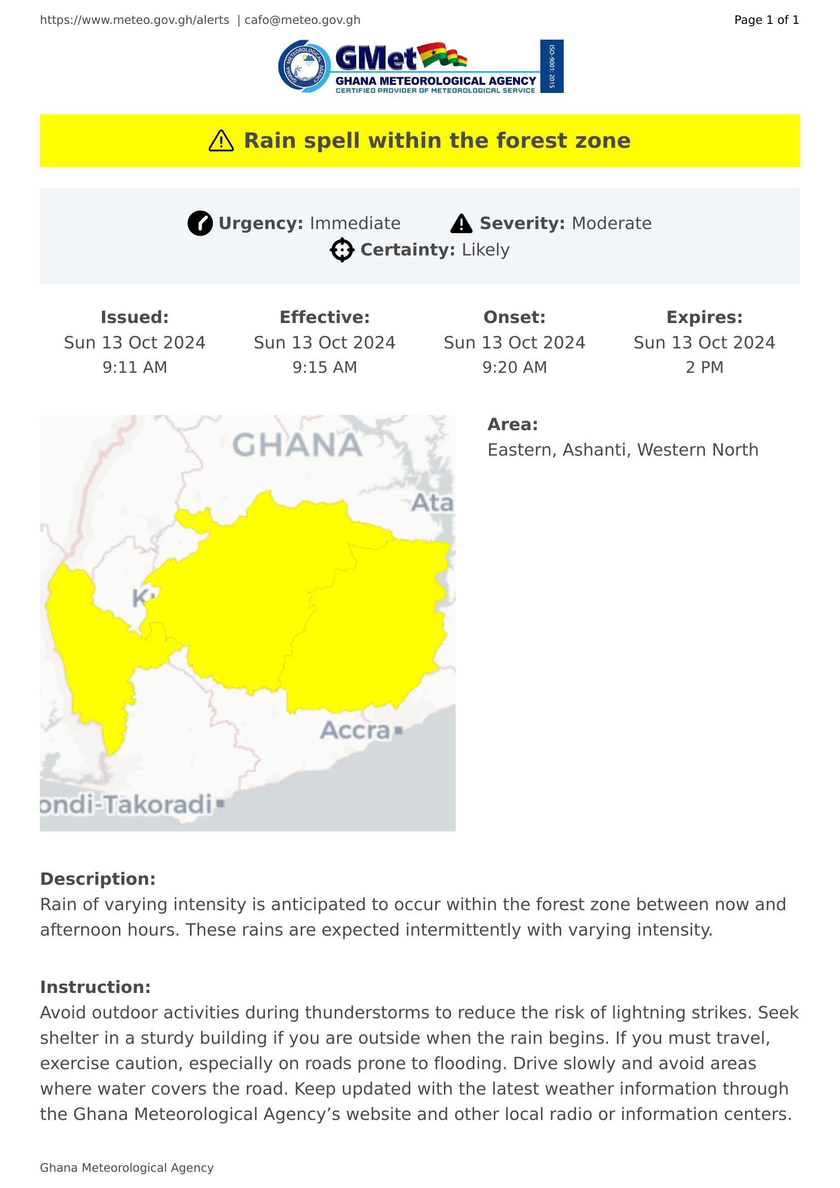 Avoid outdoor activities during thunderstorms to reduce the risk of lightning strikes. Seek shelter in a sturdy building if you are outside when the rain begins. If you must travel, exercise caution, especially on roads prone to flooding. Drive slowly and avoid areas where water covers the road. Keep updated with the latest weather information through the Ghana Meteorological Agency’s website and other local radio or information centers.