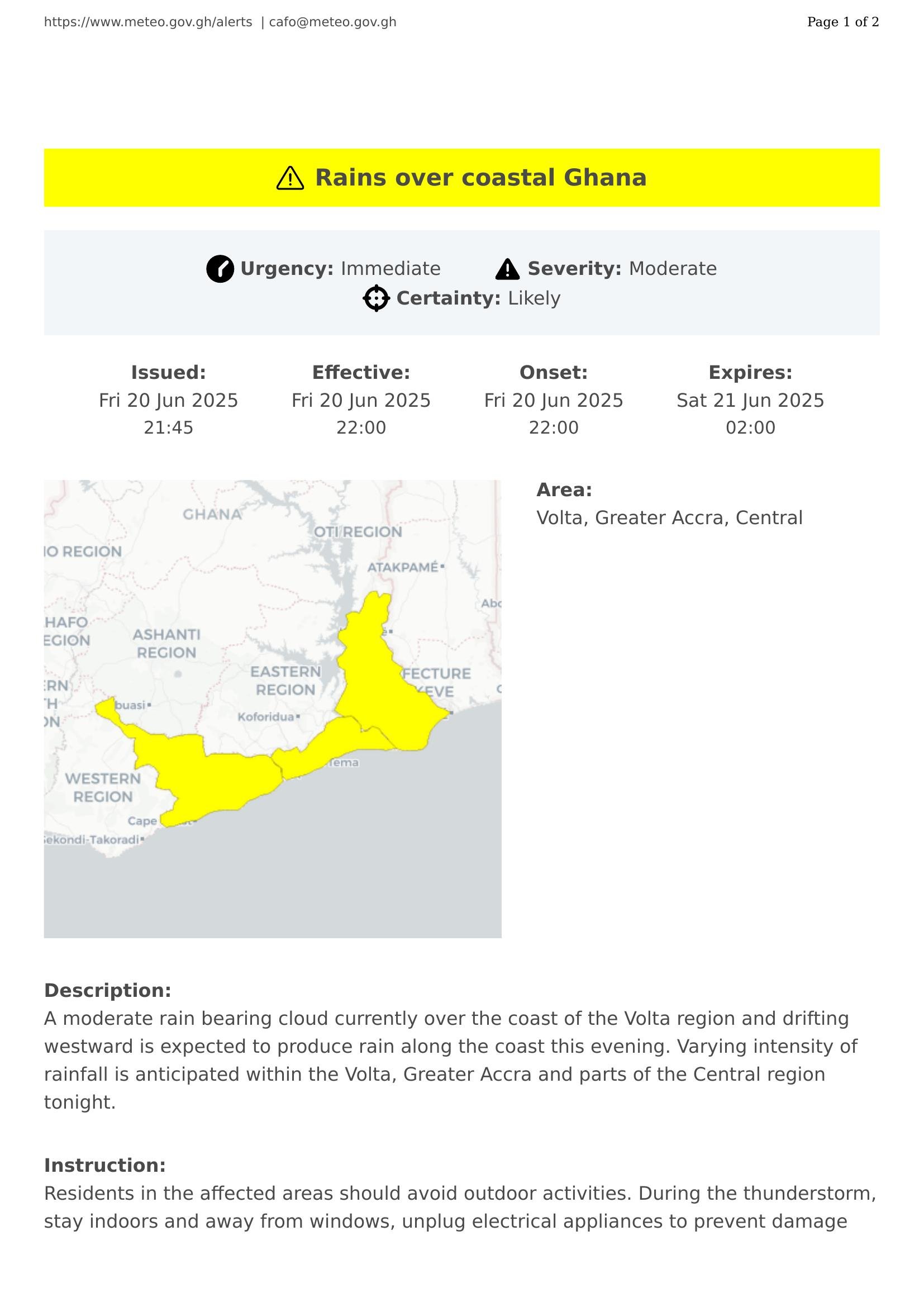 A moderate rain bearing cloud currently over the coast of the Volta region and drifting westward is expected to produce rain along the coast this evening. Varying intensity of rainfall is anticipated within the Volta, Greater Accra and parts of the Central region tonight.