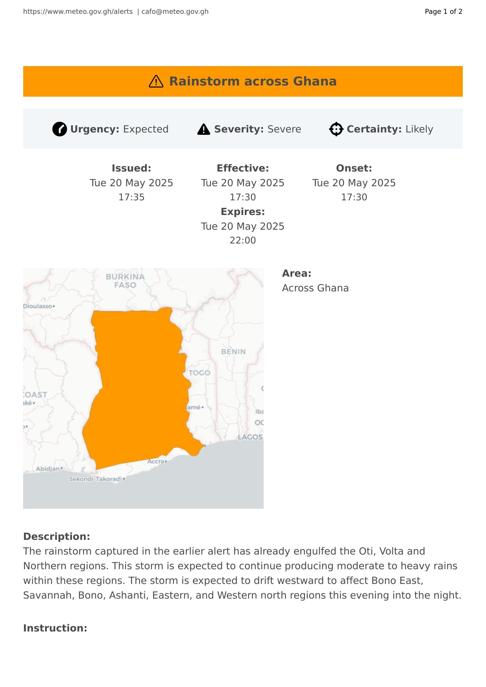 The rainstorm captured in the earlier alert has already engulfed the Oti, Volta and Northern regions. This storm is expected to continue producing moderate to heavy rains within these regions. The storm is expected to drift westward to affect Bono East, Savannah, Bono, Ashanti, Eastern, and Western north regions this evening into the night.