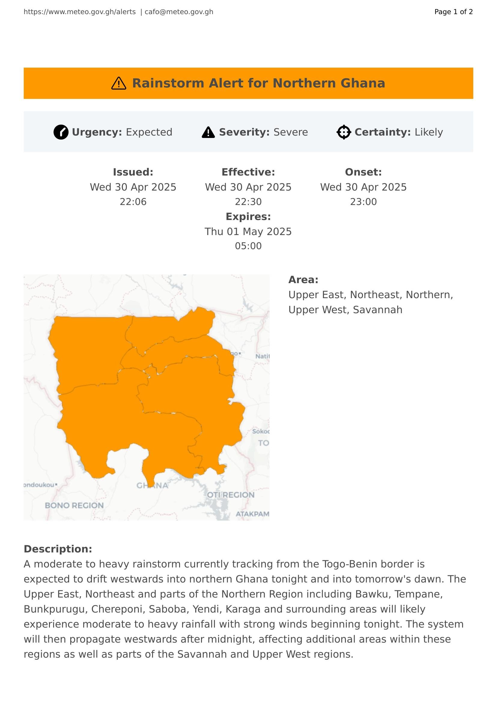 A moderate to heavy rainstorm currently tracking from the Togo-Benin border is expected to drift westwards into northern Ghana tonight and into tomorrow's dawn. The Upper East, Northeast and parts of the Northern Region including Bawku, Tempane, Bunkpurugu, Chereponi, Saboba, Yendi, Karaga and surrounding areas will likely experience moderate to heavy rainfall with strong winds beginning tonight. The system will then propagate westwards after midnight, affecting additional areas within these regions as well as parts of the Savannah and Upper West regions.