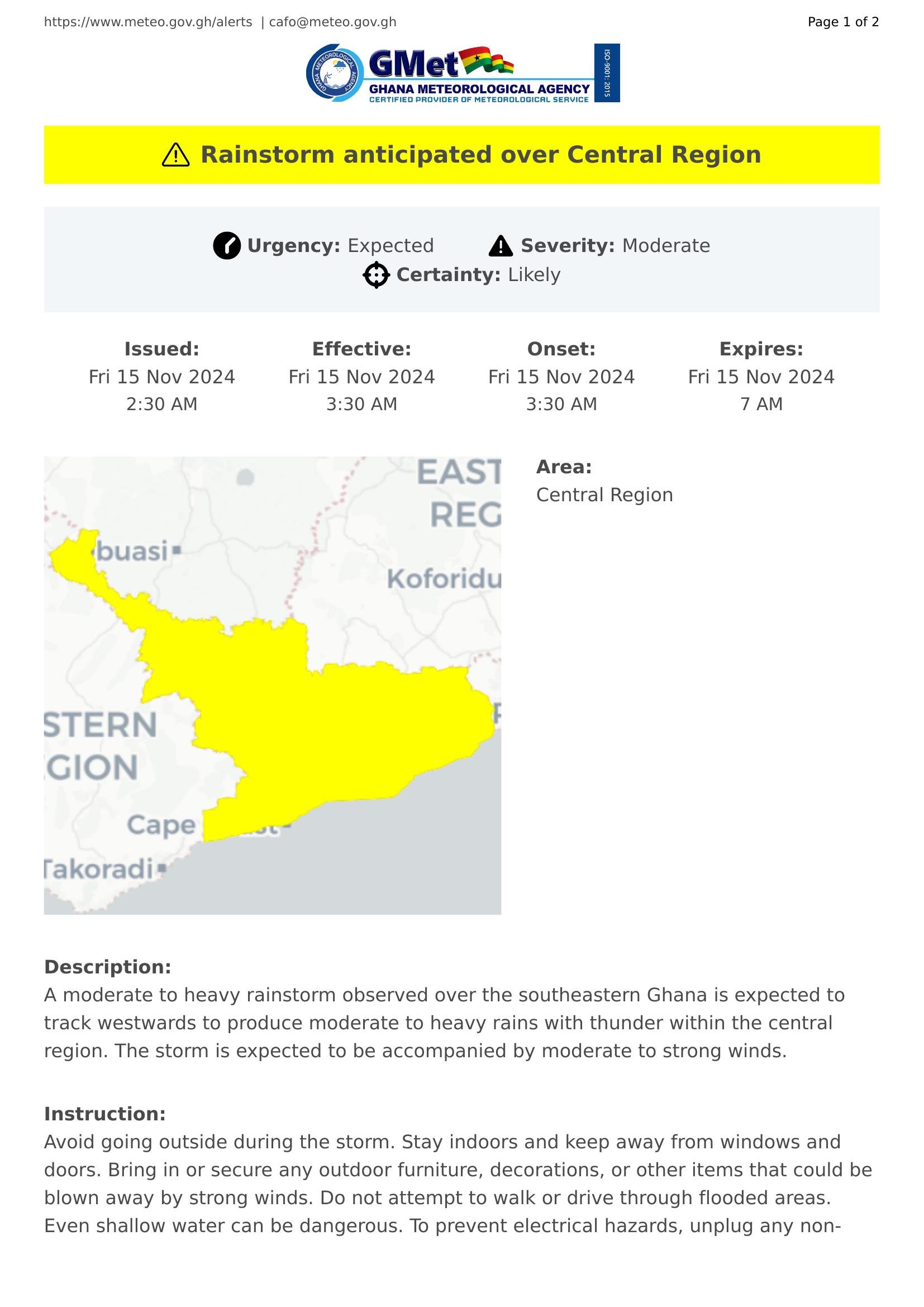 A moderate to heavy rainstorm observed over the southeastern Ghana is expected to track westwards to produce moderate to heavy rains with thunder within the central region. The storm is expected to be accompanied by moderate to strong winds.