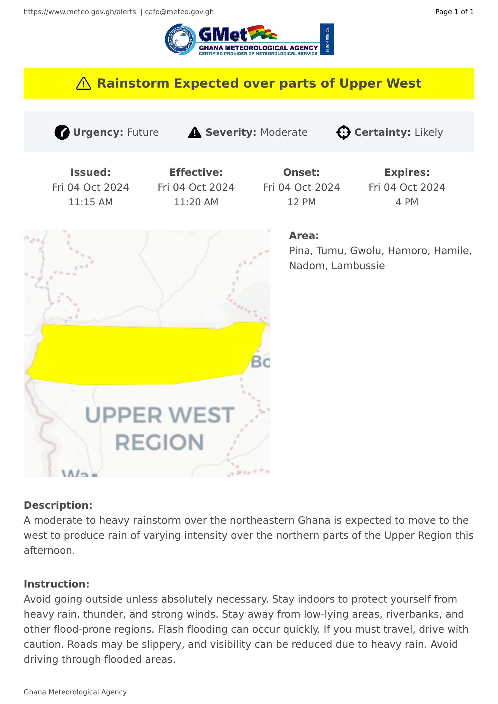 A moderate to heavy rainstorm over the northeastern Ghana is expected to move to the west to produce rain of varying intensity over the northern parts of the Upper Region this afternoon.