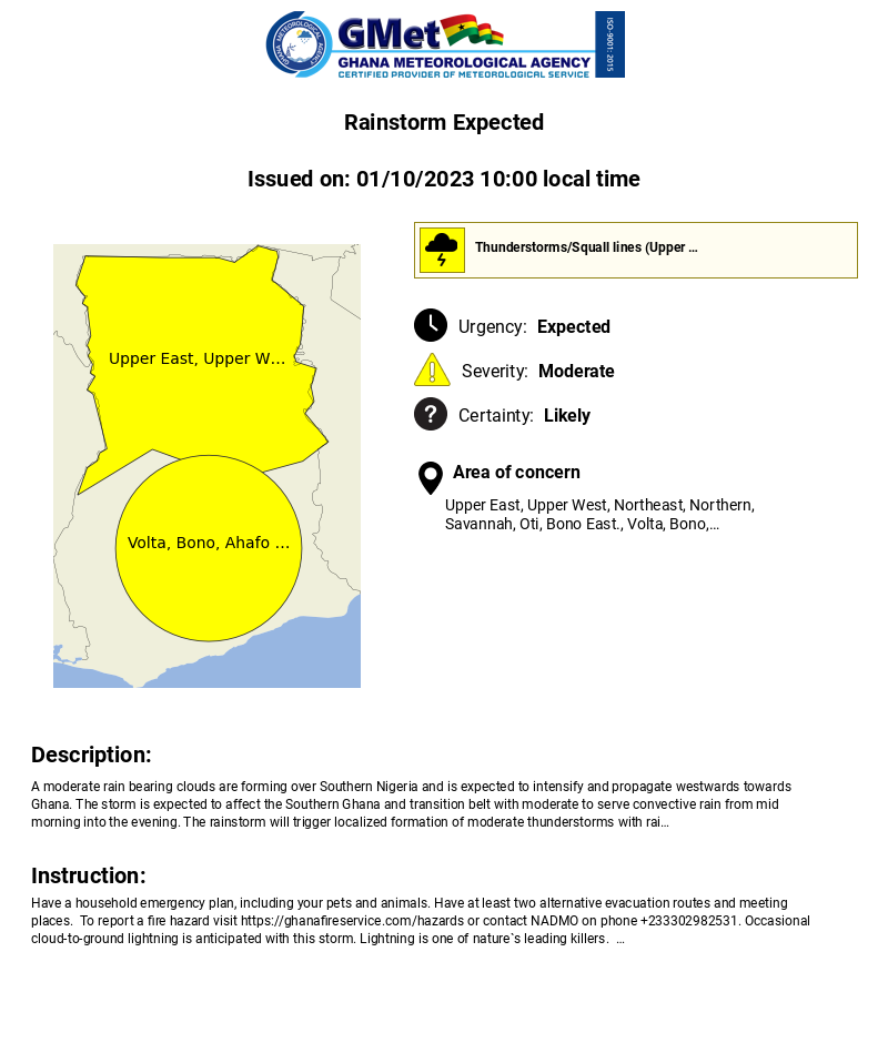 A moderate rain bearing clouds are forming over Southern Nigeria and is expected to intensify and propagate westwards towards Ghana. The storm is expected to affect the Southern Ghana and transition belt with moderate to serve convective rain from mid morning into the evening. The rainstorm will trigger localized formation of moderate thunderstorms with rain over Northern Ghana.