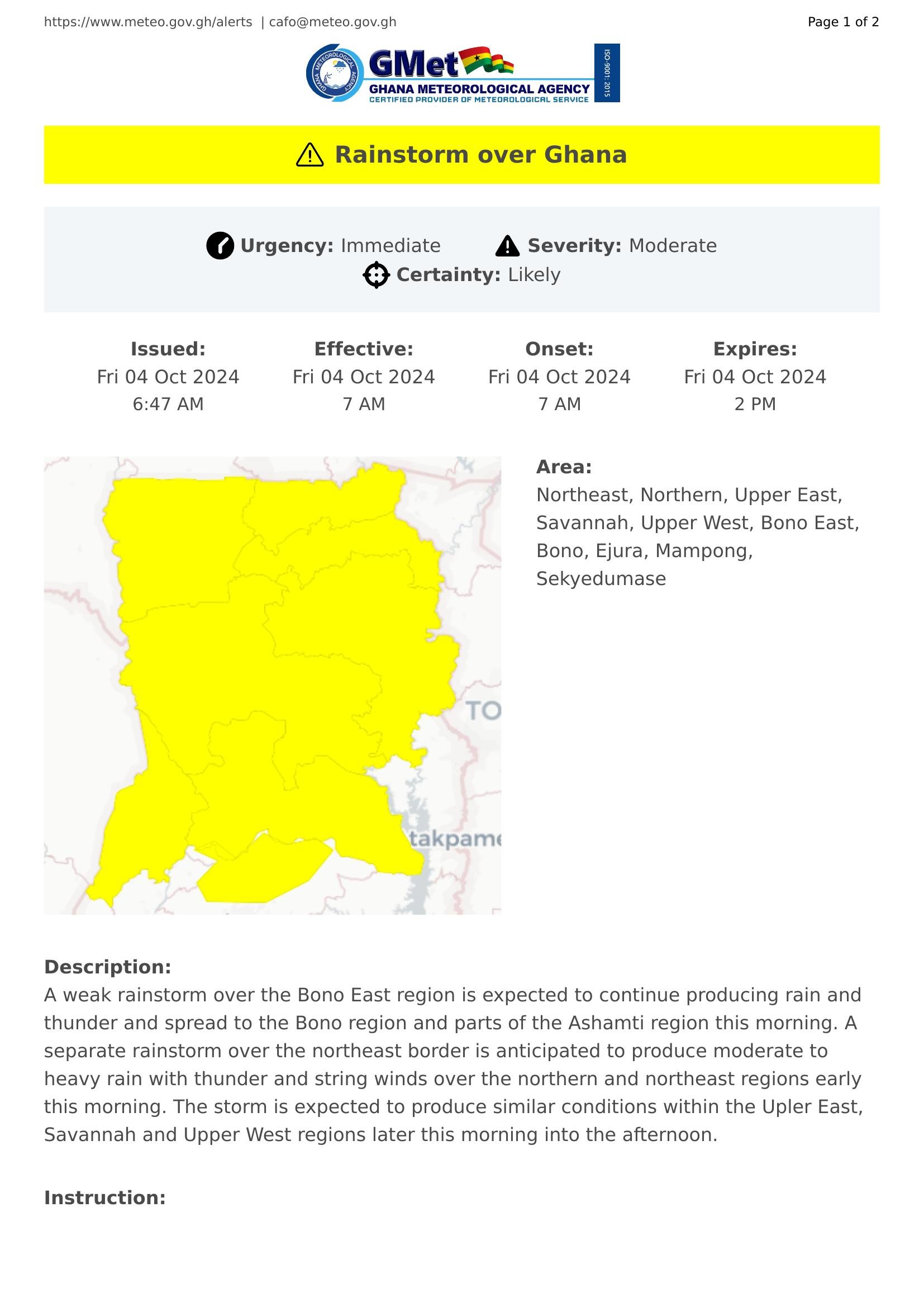 A weak rainstorm over the Bono East region is expected to continue producing rain and thunder and spread to the Bono region and parts of the Ashamti region this morning. A separate rainstorm over the northeast border is anticipated to produce moderate to heavy rain with thunder and string winds over the northern and northeast regions early this morning. The storm is expected to produce similar conditions within the Upler East, Savannah and Upper West regions later this morning into the afternoon.