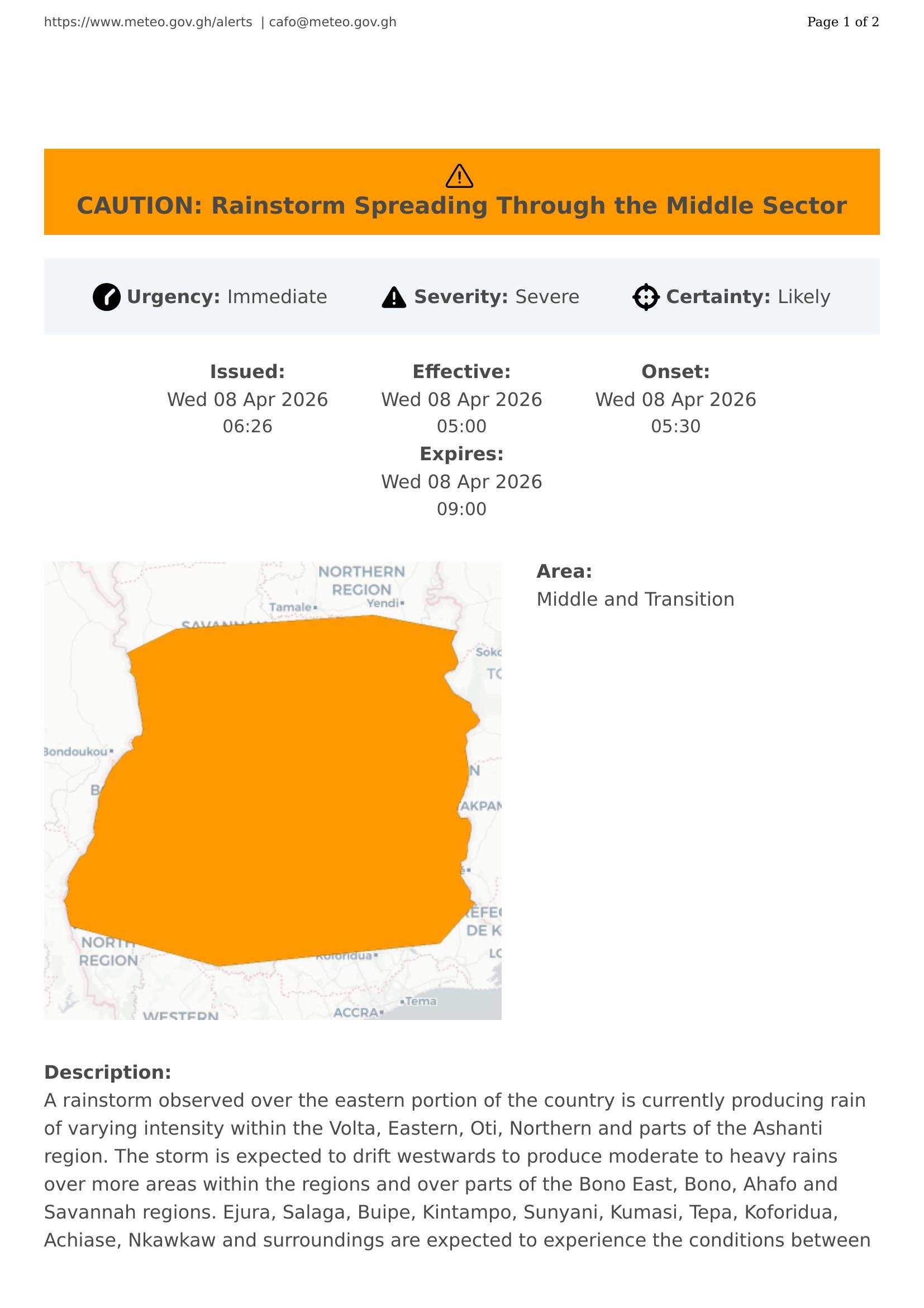A rainstorm observed over the eastern portion of the country is currently producing rain of varying intensity within the Volta, Eastern, Oti, Northern and parts of the Ashanti region. The storm is expected to drift westwards to produce moderate to heavy rains over more areas within the regions and over parts of the Bono East, Bono, Ahafo and Savannah regions. Ejura, Salaga, Buipe, Kintampo, Sunyani, Kumasi, Tepa, Koforidua, Achiase, Nkawkaw and surroundings are expected to experience the conditions between 5:30 and 9:00 am. The storm will cast cloudiness over Greater Accra with pockets of rain especially over the inland parts (Oyarifa, Pokuase, Madina, Amasaman, Afienya, Dodowa and environs).
