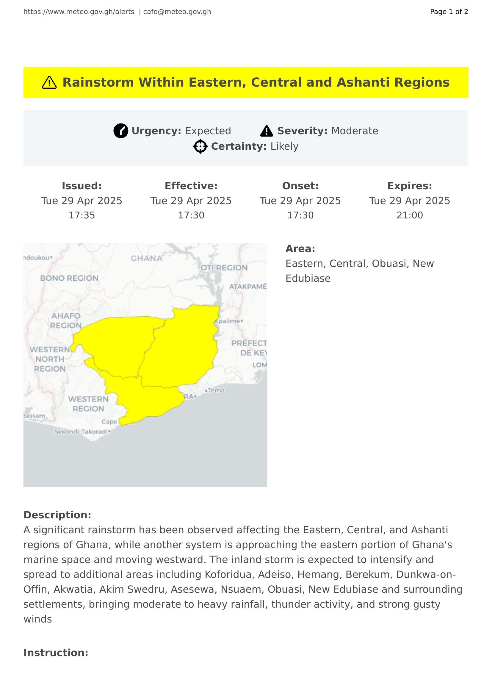 A significant rainstorm has been observed affecting the Eastern, Central, and Ashanti regions of Ghana, while another system is approaching the eastern portion of Ghana's marine space and moving westward. The inland storm is expected to intensify and spread to additional areas including Koforidua, Adeiso, Hemang, Berekum, Dunkwa-on-Offin, Akwatia, Akim Swedru, Asesewa, Nsuaem, Obuasi, New Edubiase and surrounding settlements, bringing moderate to heavy rainfall, thunder activity, and strong gusty winds
