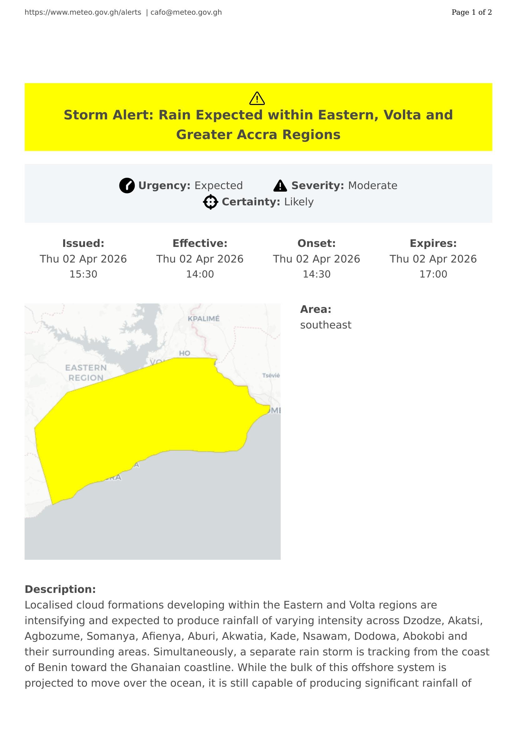 Storm Alert: Rain Expected within Eastern, Volta and Greater Accra Regions