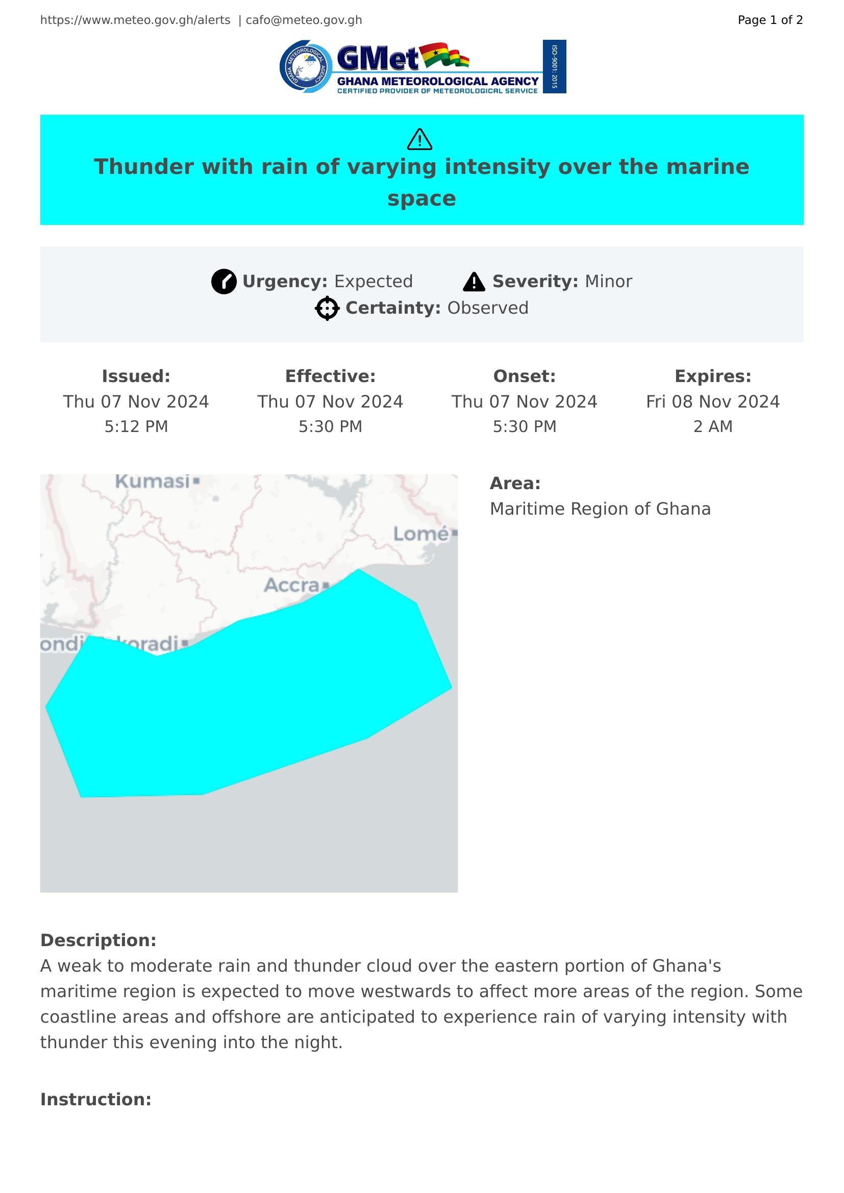 A weak to moderate rain and thunder cloud over the eastern portion of Ghana's maritime region is expected to move westwards to affect more areas of the region. Some coastline areas and offshore are anticipated to experience rain of varying intensity with thunder this evening into the night.