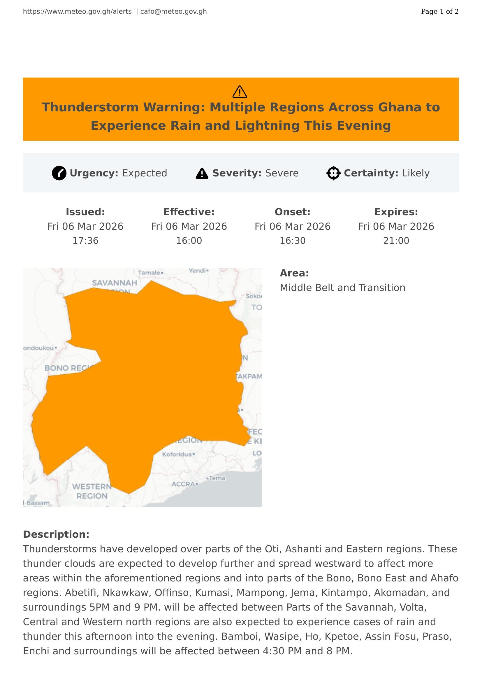 Thunderstorms have developed over parts of the Oti, Ashanti and Eastern regions. These thunder clouds are expected to develop further and spread westward to affect more areas within the aforementioned regions and into parts of the Bono, Bono East and Ahafo regions. Abetifi, Nkawkaw, Offinso, Kumasi, Mampong, Jema, Kintampo, Akomadan, and surroundings 5PM and 9 PM. will be affected between Parts of the Savannah, Volta, Central and Western north regions are also expected to experience cases of rain and thunder this afternoon into the evening. Bamboi, Wasipe, Ho, Kpetoe, Assin Fosu, Praso, Enchi and surroundings will be affected between 4:30 PM and 8 PM.