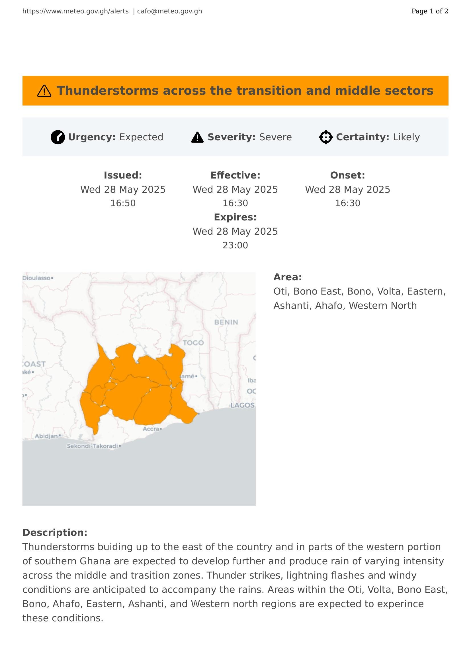 Thunderstorms buiding up to the east of the country and in parts of the western portion of southern Ghana are expected to develop further and produce rain of varying intensity across the middle and trasition zones. Thunder strikes, lightning flashes and windy conditions are anticipated to accompany the rains. Areas within the Oti, Volta, Bono East, Bono, Ahafo, Eastern, Ashanti, and Western north regions are expected to experince these conditions.