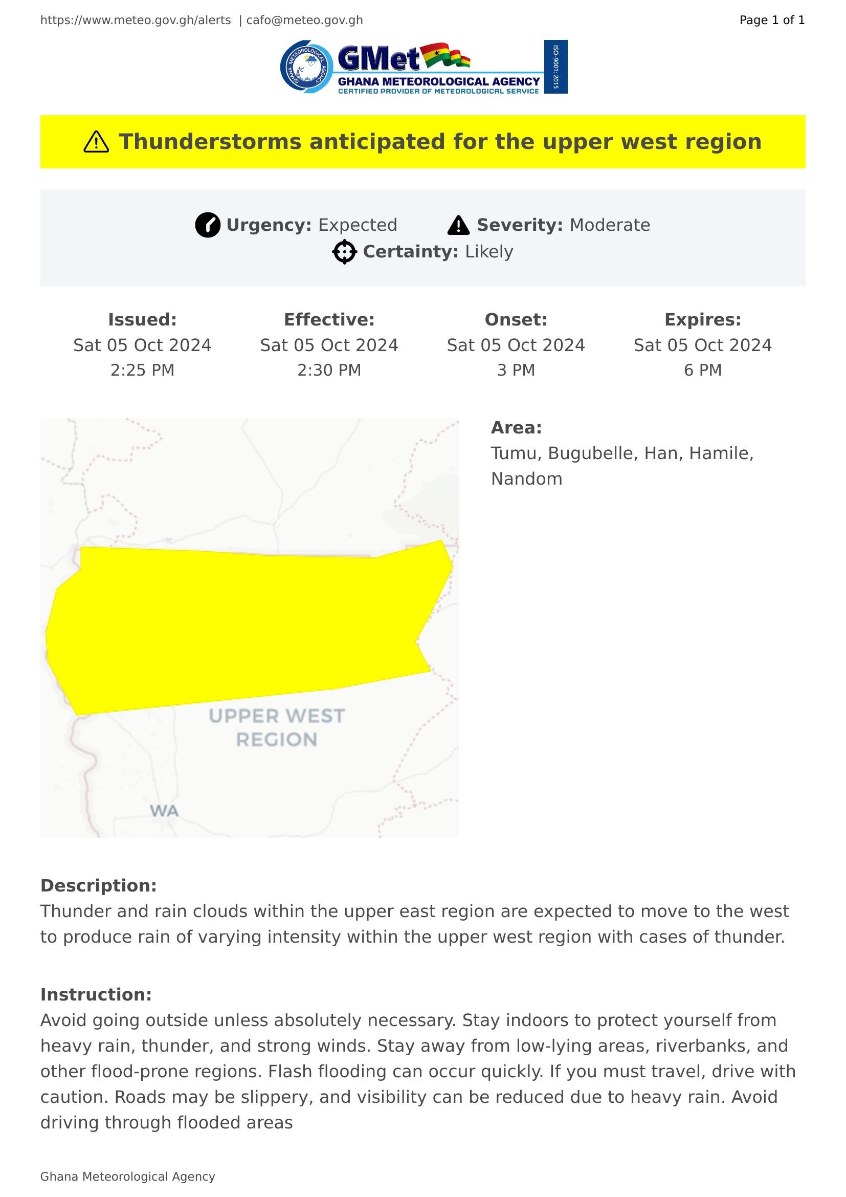 Thunder and rain clouds within the upper east region are expected to move to the west to produce rain of varying intensity within the upper west region with cases of thunder.