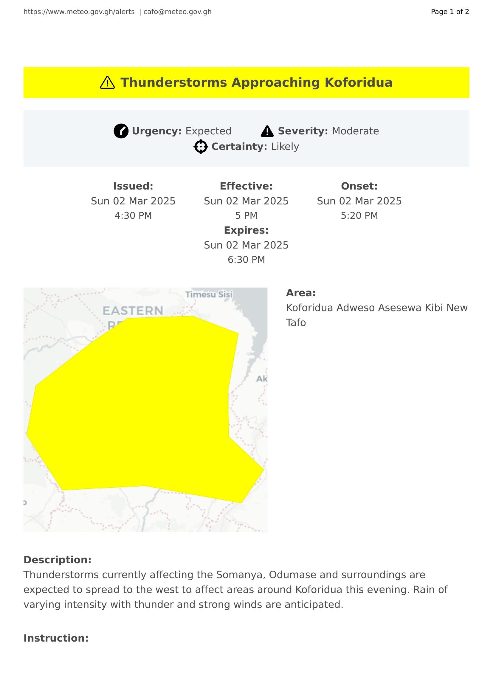 Thunderstorms currently affecting the Somanya, Odumase and surroundings are expected to spread to the west to affect areas around Koforidua this evening. Rain of varying intensity with thunder and strong winds are anticipated.