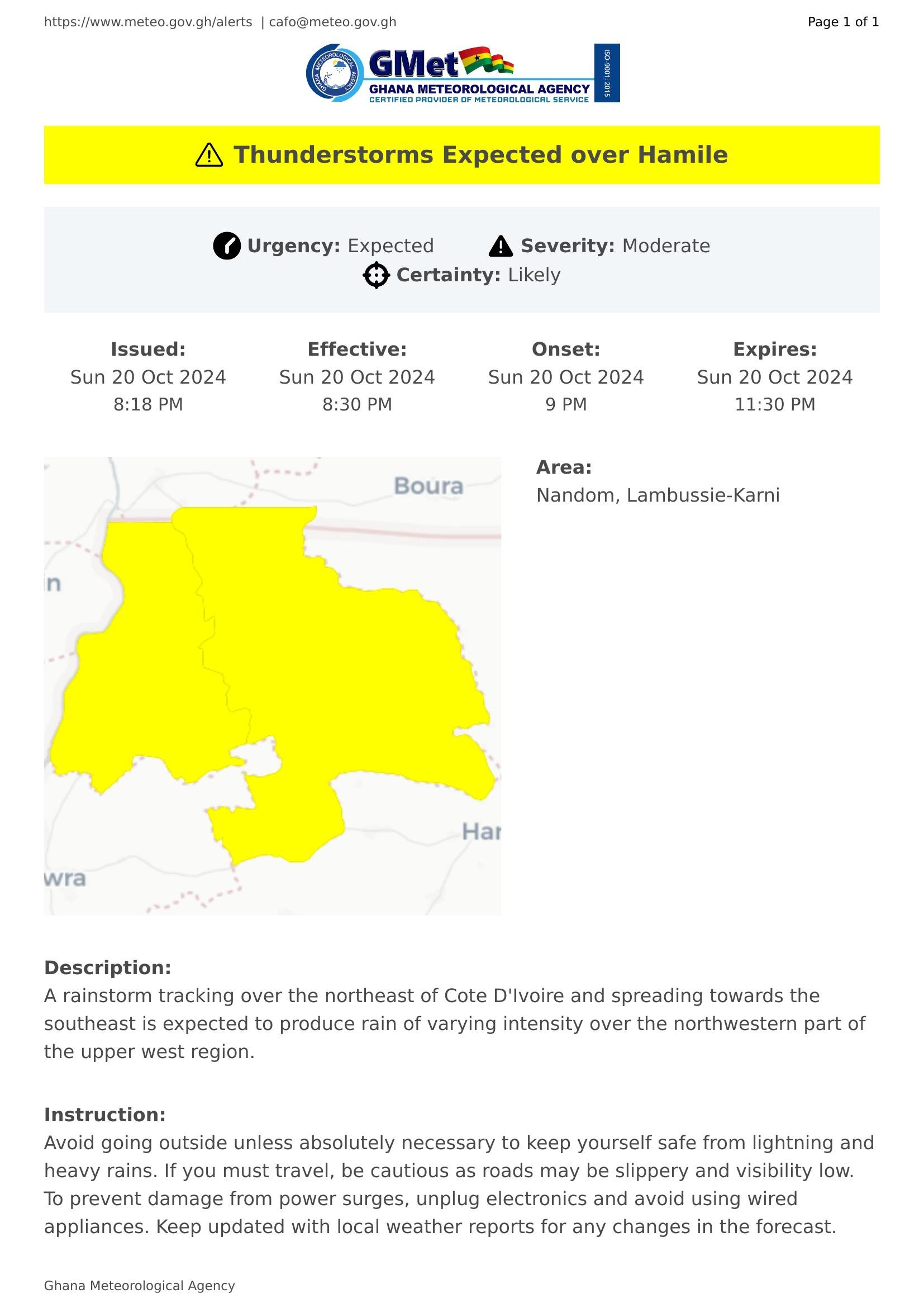 A rainstorm tracking over the northeast of Cote D'Ivoire and spreading towards the southeast is expected to produce rain of varying intensity over the northwestern part of the upper west region.