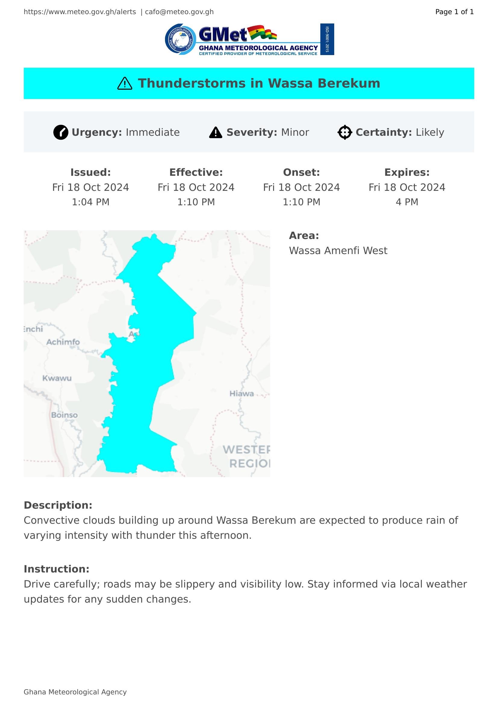 Convective clouds building up around Wassa Berekum are expected to produce rain of varying intensity with thunder this afternoon.