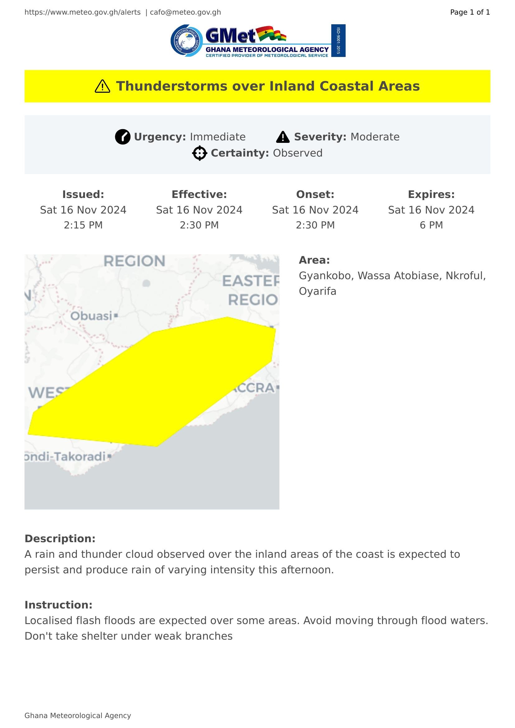A rain and thunder cloud observed over the inland areas of the coast is expected to persist and produce rain of varying intensity this afternoon.