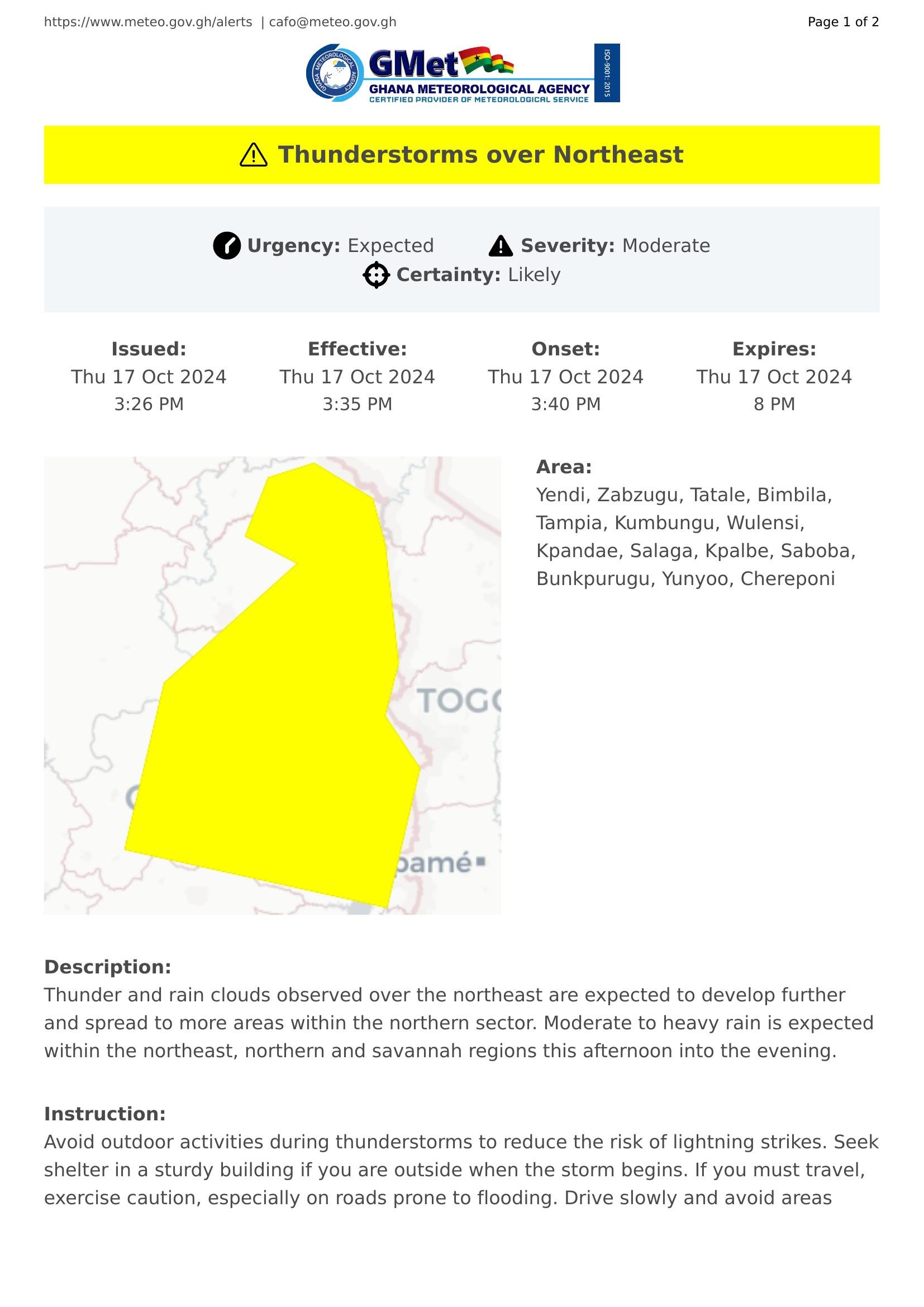 Thunder and rain clouds observed over the northeast are expected to develop further and spread to more areas within the northern sector. Moderate to heavy rain is expected within the northeast, northern and savannah regions this afternoon into the evening.