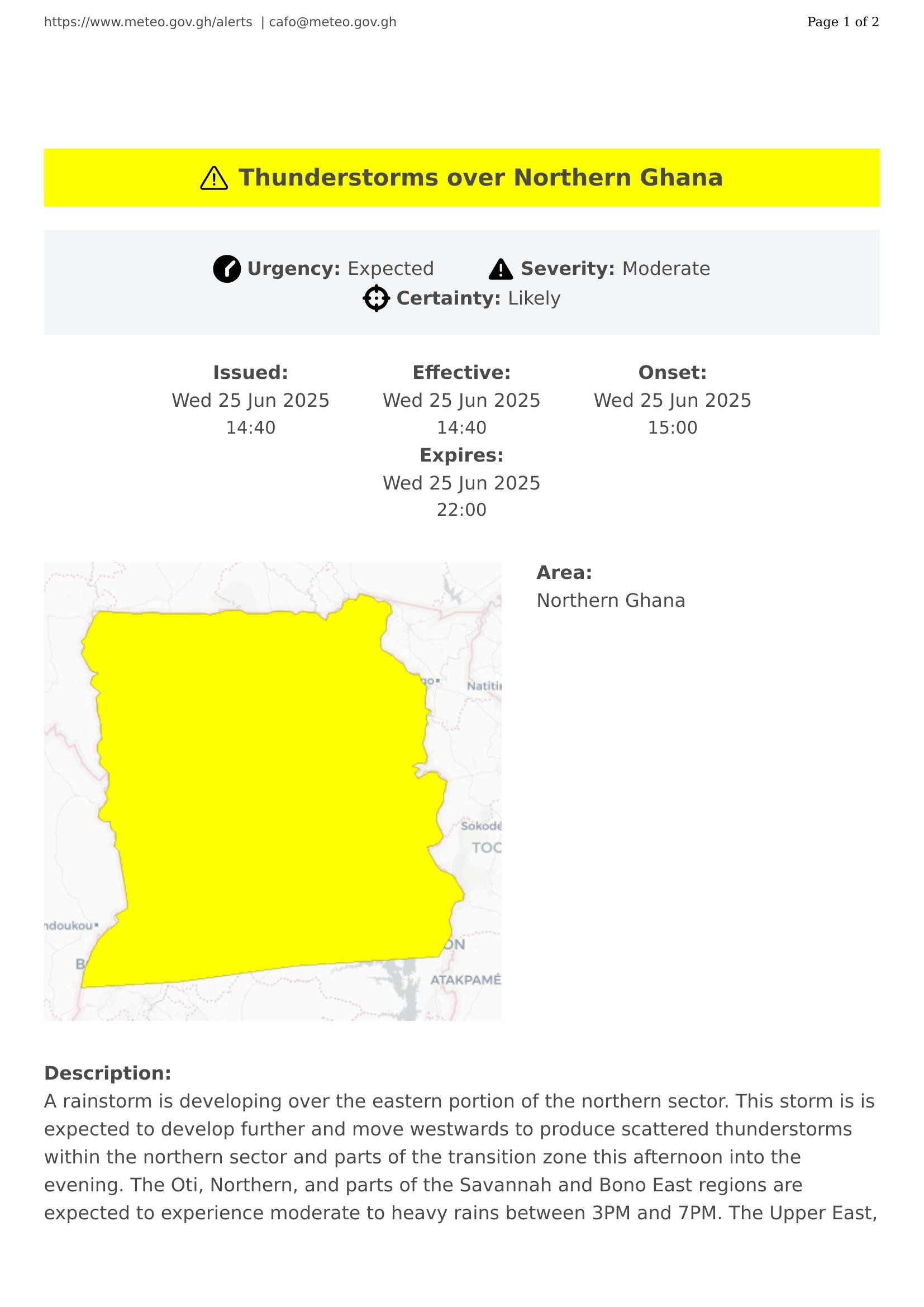 A rainstorm is developing over the eastern portion of the northern sector. This storm is is expected to develop further and move westwards to produce scattered thunderstorms within the northern sector and parts of the transition zone this afternoon into the evening. The Oti, Northern, and parts of the Savannah and Bono East regions are expected to experience moderate to heavy rains between 3PM and 7PM. The Upper East, Northeast, Upper West, and Bono regions are also expected to experience similar conditions between 5PM and 10PM.